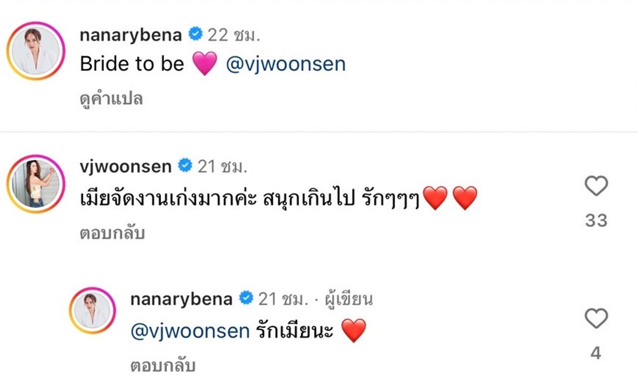 ซึ่งบรรยากาศเป็นไปอย่างสนุกสนาน สนุกสุดเหวี่ยงสุดๆ ดูได้จากสีหน้าว่าที่เจ้าสาวและเพื่อนที่ยิ้มแย้มและหัวเราะกันเต็มที่ และ วุ้นเส้น ยังเข้าไปคอมเมนต์ตอบกลับ นานา ว่า “เมียจัดงานเก่งมากค่ะ สนุกเกินไป รักๆๆๆ” และ นานา ก็ตอบว่า “รักเมียนะ”.