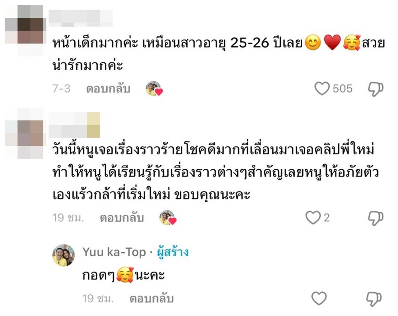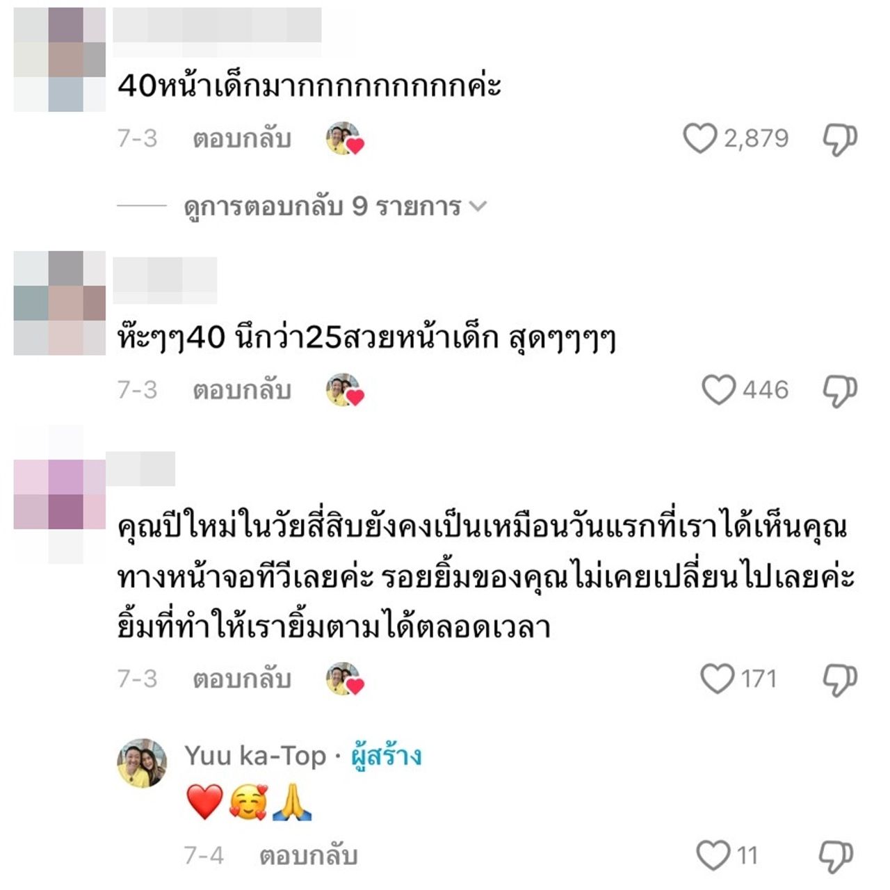 ส่องคอมเมนต์จากชาวเน็ตต่างบอกว่า ปีใหม่ หน้าเด็กมากๆ อาทิ 40 หน้าเด็กมากกกกกกกกกค่ะ, ห้ะๆๆ 40 นึกว่า 25 สวยหน้าเด็ก สุดๆๆๆๆ, คุณปีใหม่ในวัยสี่สิบยังคงเป็นเหมือนวันแรกที่เราได้เห็นคุณทางหน้าจอทีวีเลยค่ะ รอยยิ้มของคุณไม่เคยเปลี่ยนไปเลยค่ะ ยิ้มที่ทำให้เรายิ้มตามได้ตลอดเวลา, หน้าเด็กมากค่ะ เหมือนสาวอายุ 25-26 ปีเลย สวยน่ารักมากค่ะ, ห้ะ หน้าเด็กมากกกกกกก, 40 หน้าเด็กมาก ฯลฯ