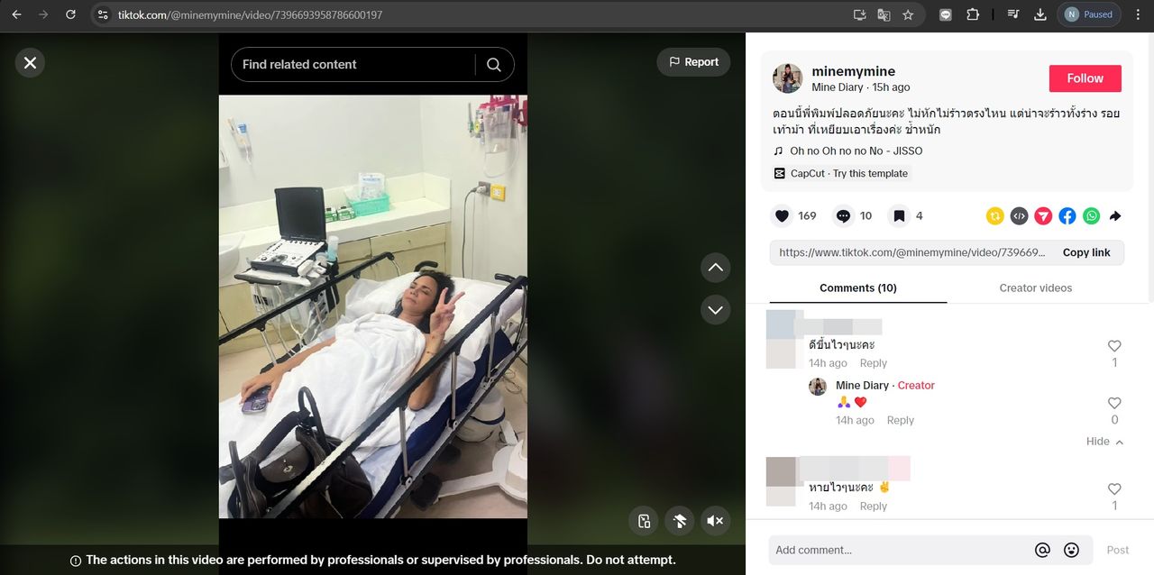 และล่าสุดผู้ใช้ TikTok รายนี้ก็ได้โพสต์ภาพและคลิปนาทีก่อนที่ พิม ซอนย่า เกิดอุบัติเหตุ และหลังเกิดเหตุจนถึงตอนเข้า รพ. พร้อมทั้งอัปเดตอาการล่าสุดว่า “ตอนนี้พี่พิมพ์ปลอดภัยนะคะ ไม่หักไม่ร้าวตรงไหน แต่น่าจะร้าวทั้งร่าง รอยเท้าม้า ที่เหยียบเอาเรื่องค่ะ ช้ำหนัก”.