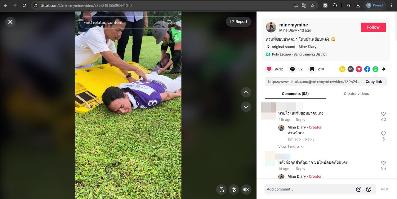 ซึ่งในคลิปนี้ พิม ซอนย่า ที่เกิดอุบัติเหตุตกม้า นอนคว่ำหน้าอยู่บนสนามหญ้า และมีหน่วยปฐมพยาบาลเข้ามาช่วยกันนำตัวส่ง รพ.ทันที โดยมีแฟนๆ เข้ามาคอมเมนต์ให้กำลังใจและอวยพรขอให้หายเจ็บไวๆ เป็นจำนวนมาก