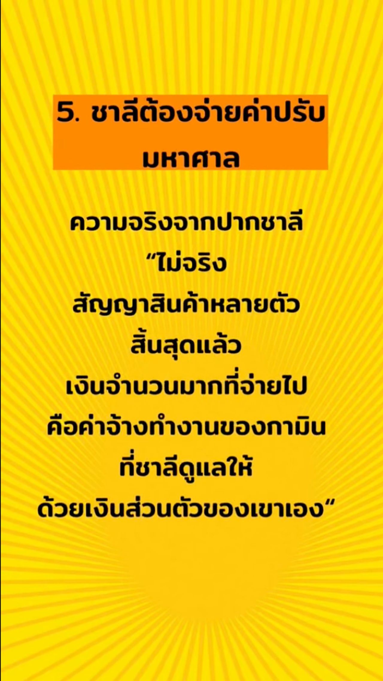 5. ชาลีต้องจ่ายค่าปรับมหาศาล – ความจริงจากปากชาลี “ไม่จริง สัญญาสินค้าหลายตัวสิ้นสุดแล้ว เงินจำนวนมากที่จ่ายไป คือ ค่าจ้างทำงานของกามินที่ชาลีดูแลให้ ด้วยเงินส่วนตัวของเขาเอง”