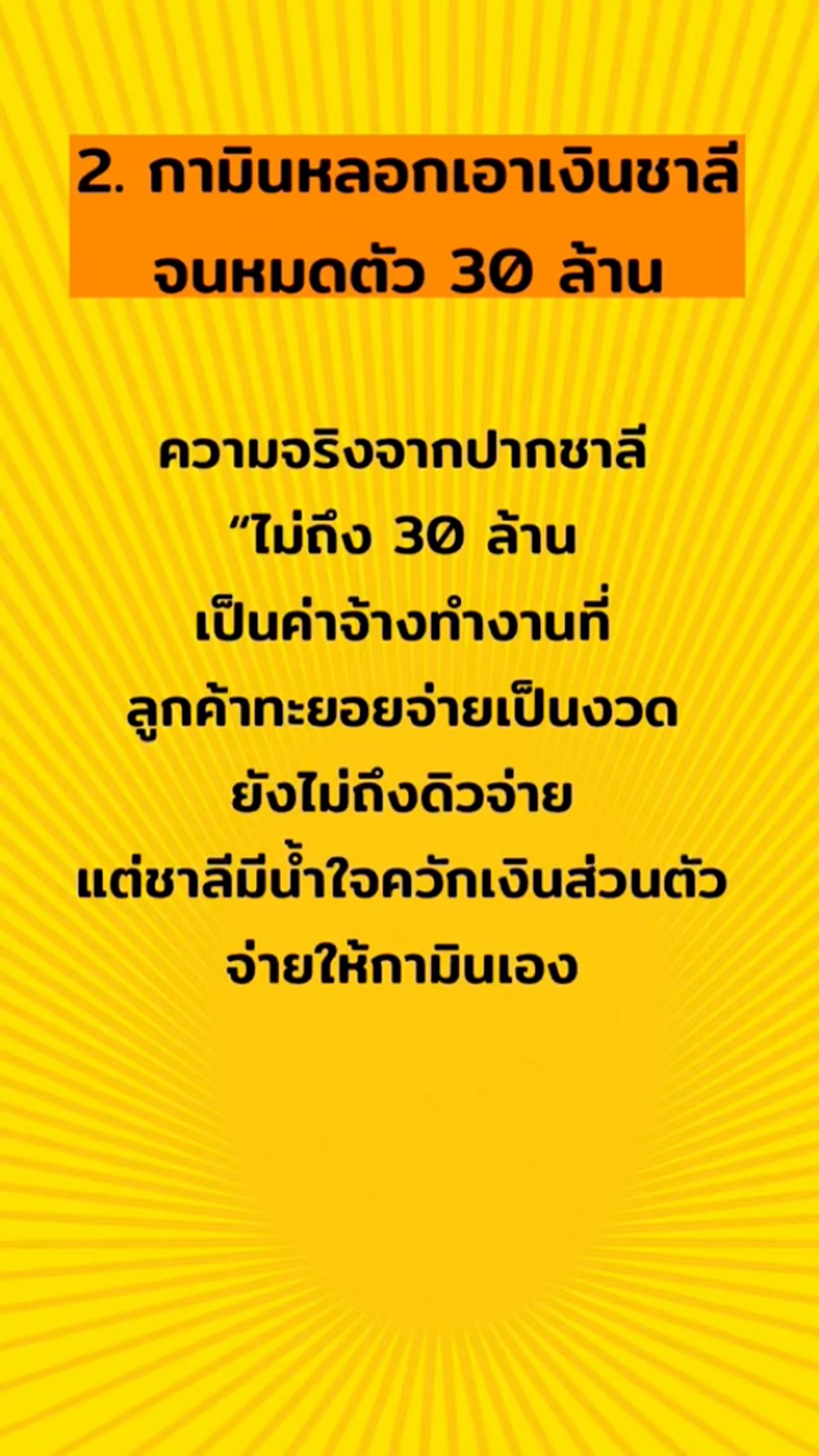 2. กามินหลอกเอาเงินชาลีจนหมดตัว 30 ล้าน – “ความจริงจากปากชาลี ไม่ถึง 30 ล้าน เป็นค่าจ้างทำงานที่ลูกค้าทยอยจ่ายเป็นงวด ยังไม่ถึงดีลจ่าย แต่ชาลีมีน้ำใจควักเงินส่วนตัวจ่ายให้กามินเอง”