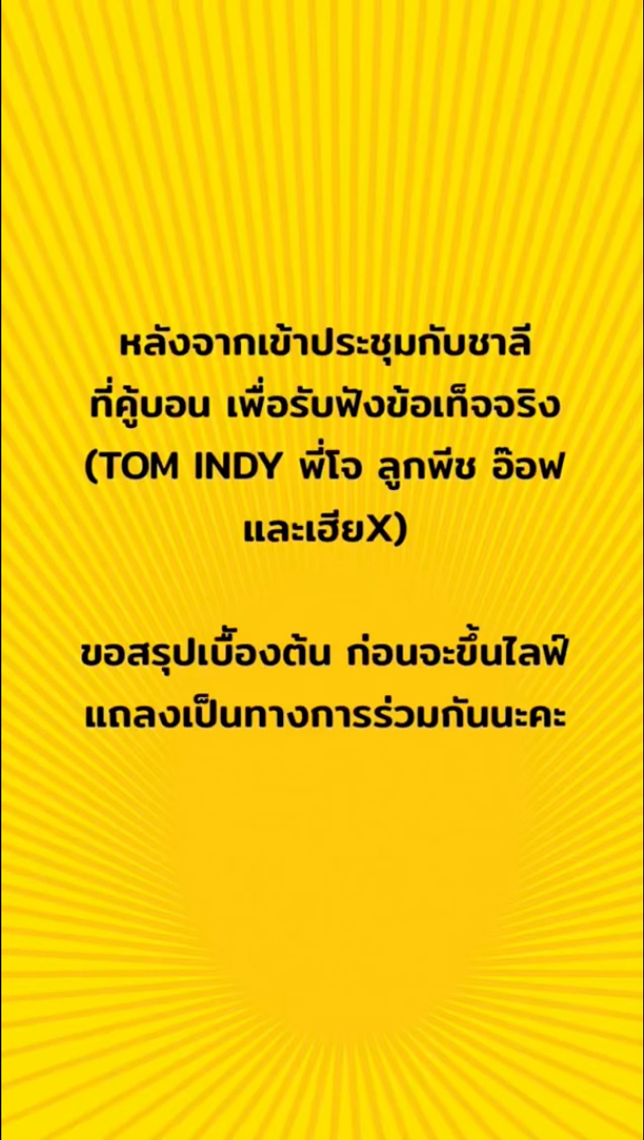 “หลังจากเข้าประชุมกับชาลีที่คู้บอน เพื่อรับฟังข้อเท็จจริง (TOM INDY พี่โจ ลูกพีช อ๊อฟ และ เฮีย X) ขอสรุปเบื้องต้น ก่อนจะขึ้นไลฟ์แถลงเป็นทางการร่วมกันนะคะ แก้ความเท็จด้วยความจริงทีละข้อ