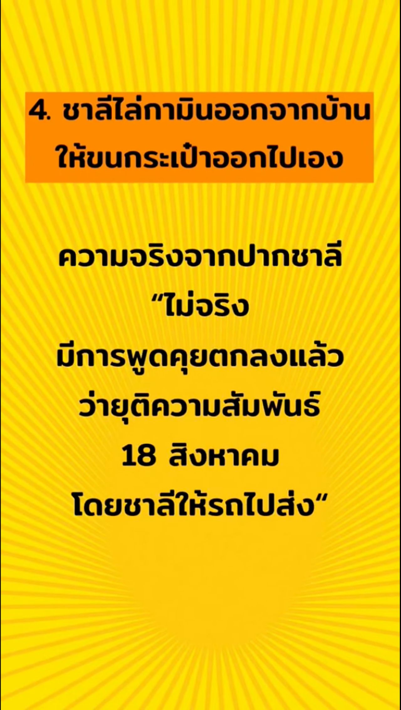 4. ชาลีไล่กามินออกจากบ้าน ให้ขนกระเป๋าออกไปเอง – ความจริงจากปากชาลี “ไม่จริง มีการพูดคุยตกลงแล้วว่ายุติความสัมพันธ์ 18 สิงหาคม โดยชาลีให้รถไปส่ง”