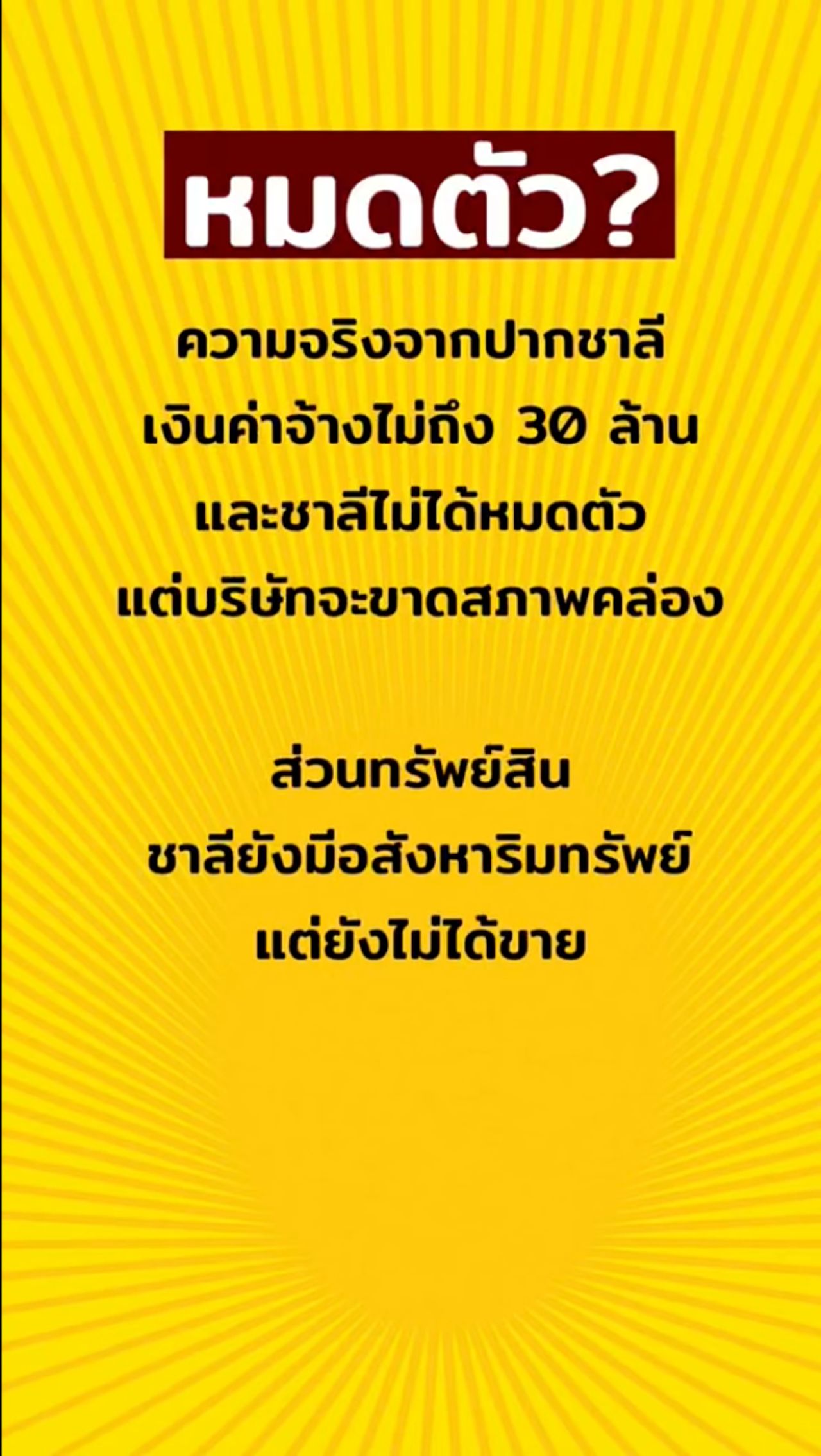 หมดตัว? – ความจริงจากปากชาลี เงินค่าจ้างไม่ถึง 30 ล้าน และชาลีไม่ได้หมดตัว แต่บริษัทจะขาดสภาพคล่อง ส่วนทรัพย์สินชาลียังมีอสังหาริมทรัพย์ แต่ยังไม่ได้ขาย