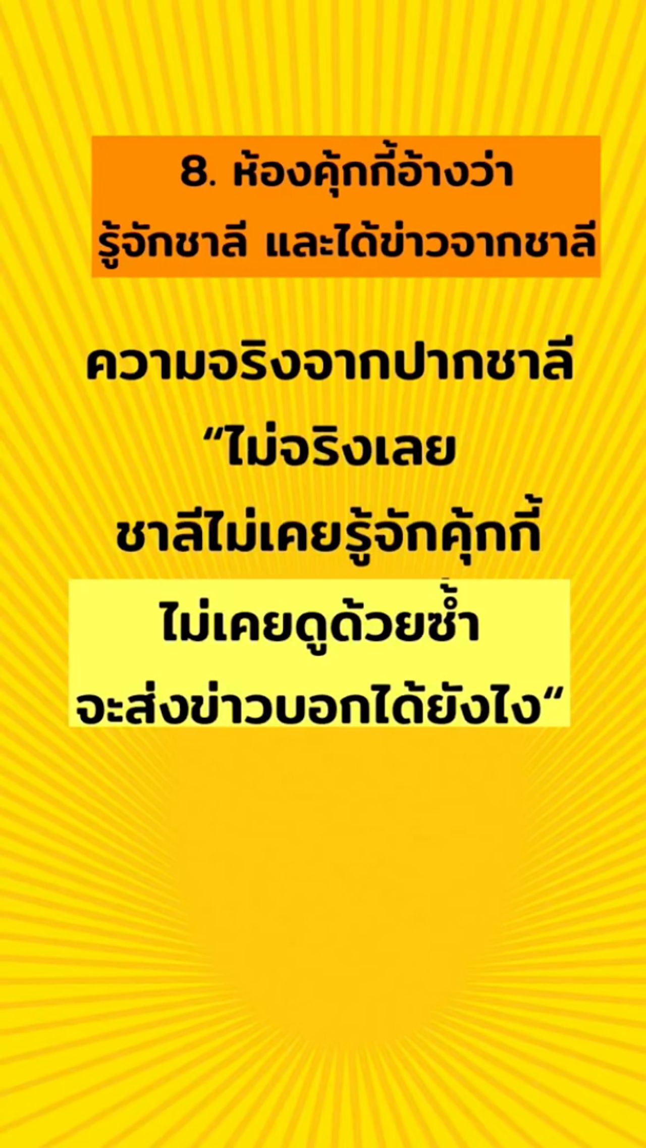 8. ห้องคุกกี้อ้างว่ารู้จักชาลี และได้ข่าวชาลี – ความจริงจากปากชาลี “ไม่จริงเลย ชาลีไม่เคยรู้จักคุกกี้ ไม่เคยดูด้วยซ้ำ จะส่งข่าวบอกได้ยังไง”