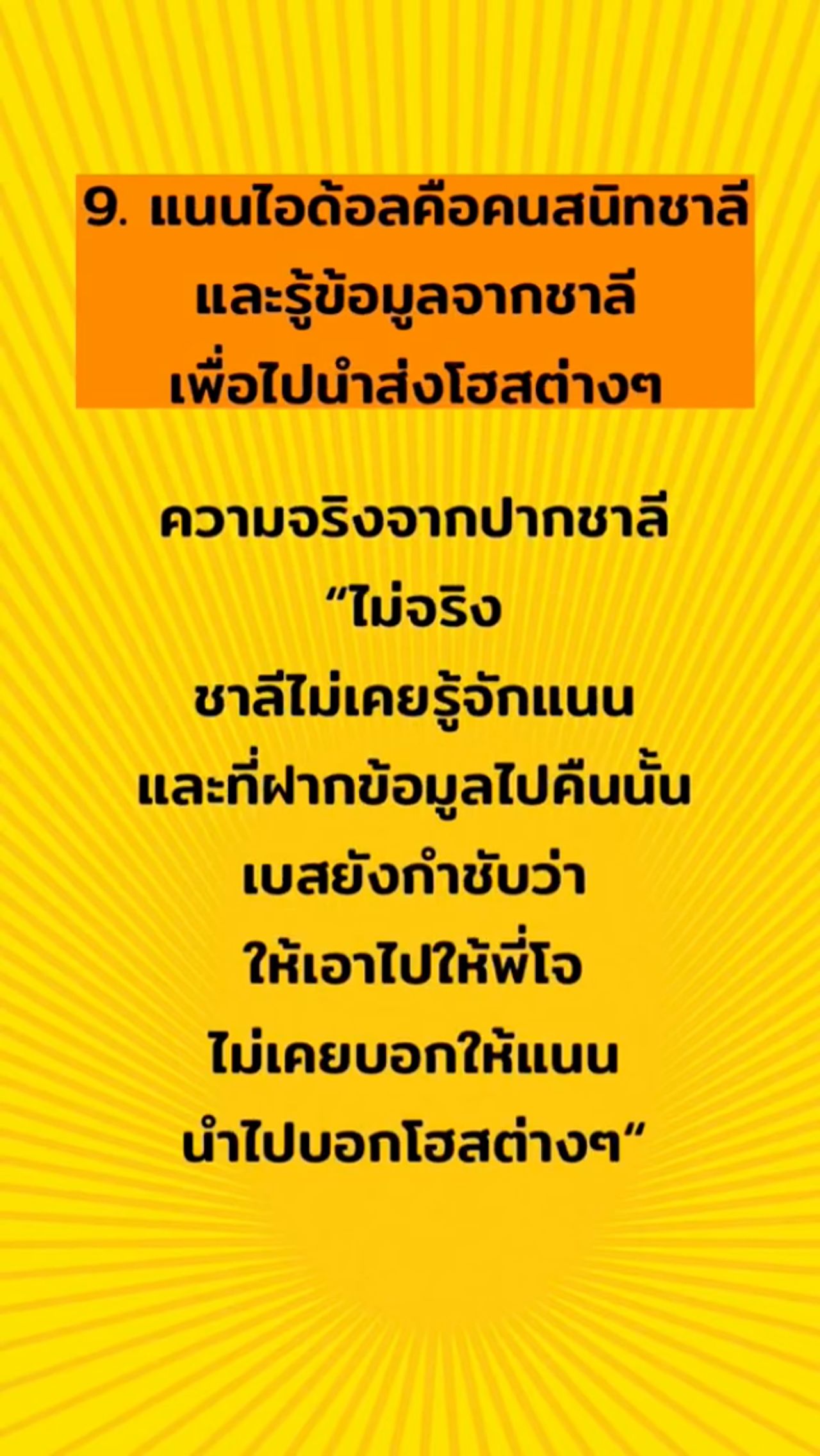 9. แนนไอดอลคือคนสนิทชาลี และรู้ข้อมูลจากชาลี เพื่อไปนำส่งโฮสต์ต่างๆ – ความจริงจากปากชาลี “ไม่จริง ชาลีไม่เคยรู้จักแนน และที่ฝากข้อมูลไปคืนนั้น เบสยังกำชับว่าให้เอาไปให้พี่โจ ไม่เคยบอกให้แนนนำไปบอกโฮสต์ต่างๆ”