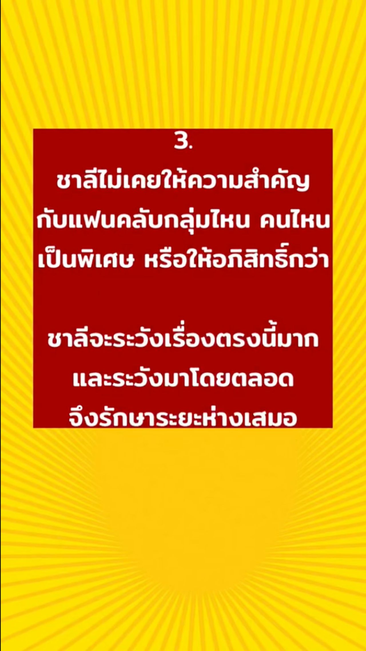 3. ชาลีไม่เคยให้ความสำคัญกับแฟนคลับกลุ่มไหน คนไหนเป็นพิเศษ หรือให้อภิสิทธิ์กว่า ชาลีจะระวังเรื่องตรงนี้มาก และระวังมาโดยตลอด จึงรักษาระยะห่างเสมอ