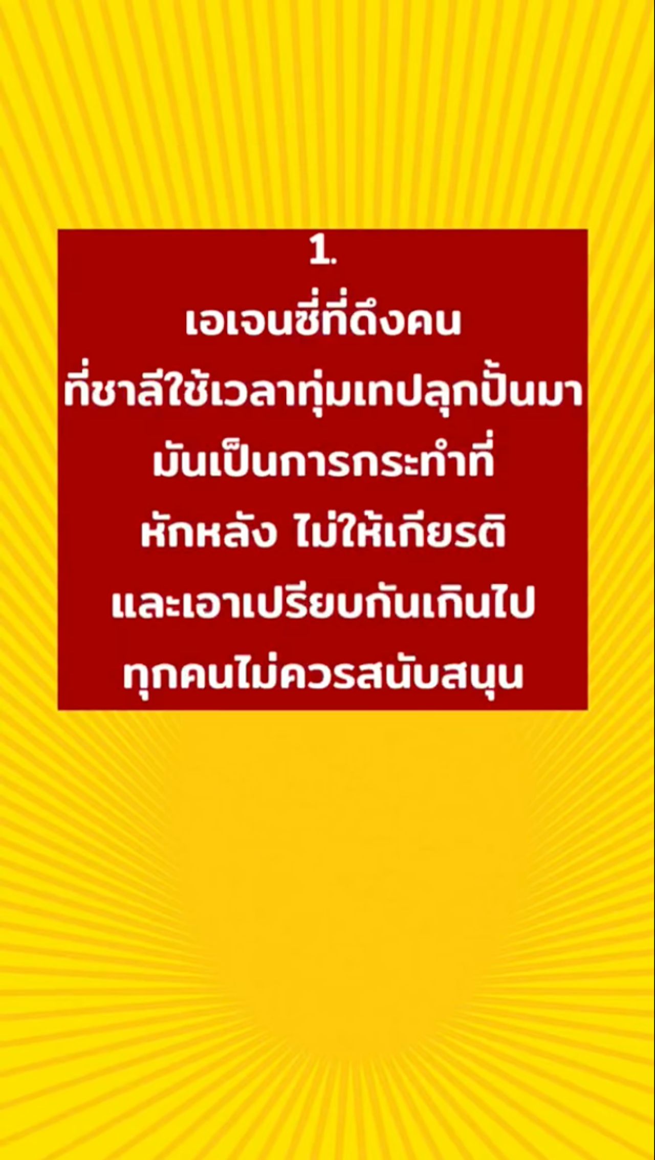 1. เอเจนซี่ที่ดึงคนที่ชาลีใช้เวลาทุ่มเทปลุกปั้นมา มันเป็นการกระทำที่หักหลัง ไม่ให้เกียรติ และเอาเปรียบกันเกินไป ทุกคนไม่ควรสนับสนุน