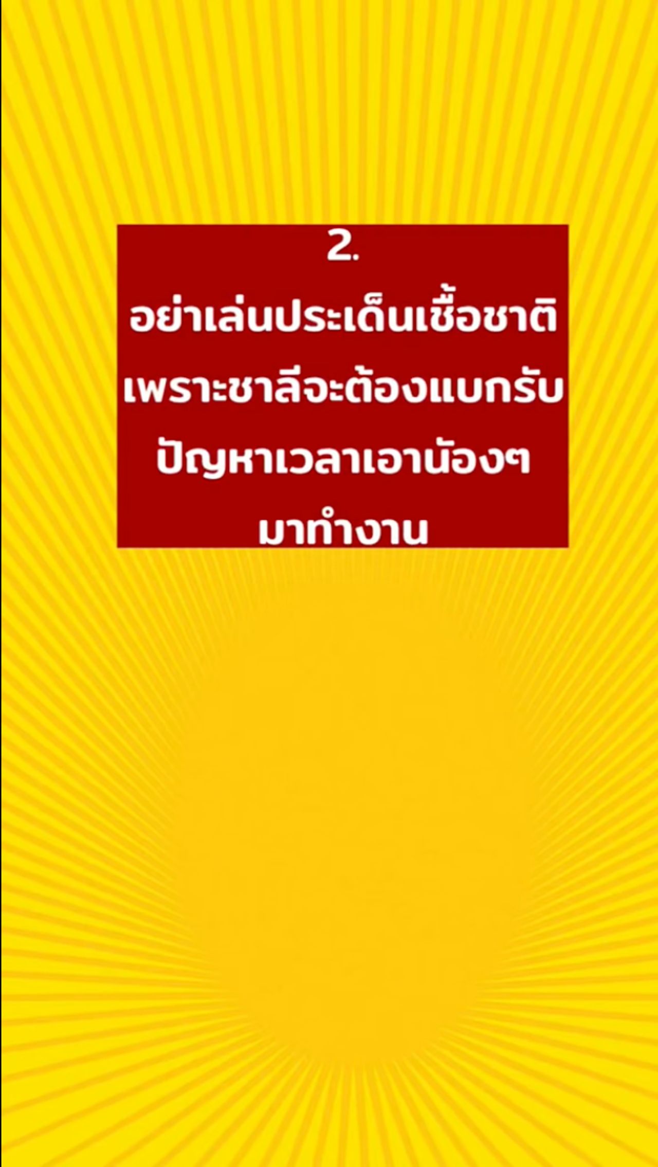 2. อย่าเล่นประเด็นเชื้อชาติ เพราะชาลีจะต้องแบกรับปัญหาเวลาเอาน้องๆ มาทำงาน
