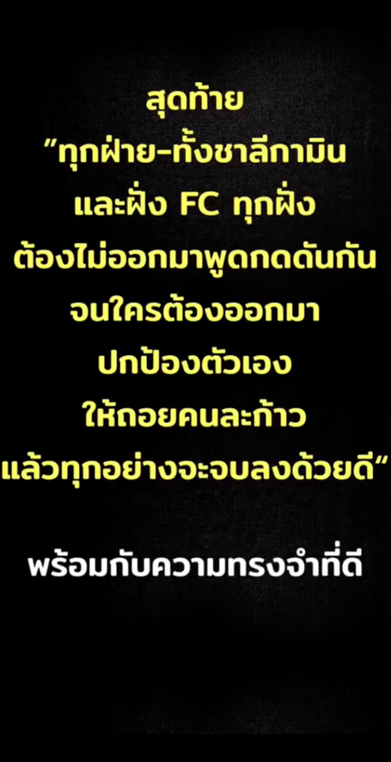 สุดท้าย ทุกฝ่าย ทั้งชาลี กามิน และฝั่ง FC ทุกฝั่ง ต้องไม่ออกมาพูดกดดันกัน จนใครต้องออกมาปกป้องตัวเอง ให้ถอยคนละก้าว แล้วทุกอย่างจะจบลงด้วยดี พร้อมกับความทรงจำที่ดี”.
