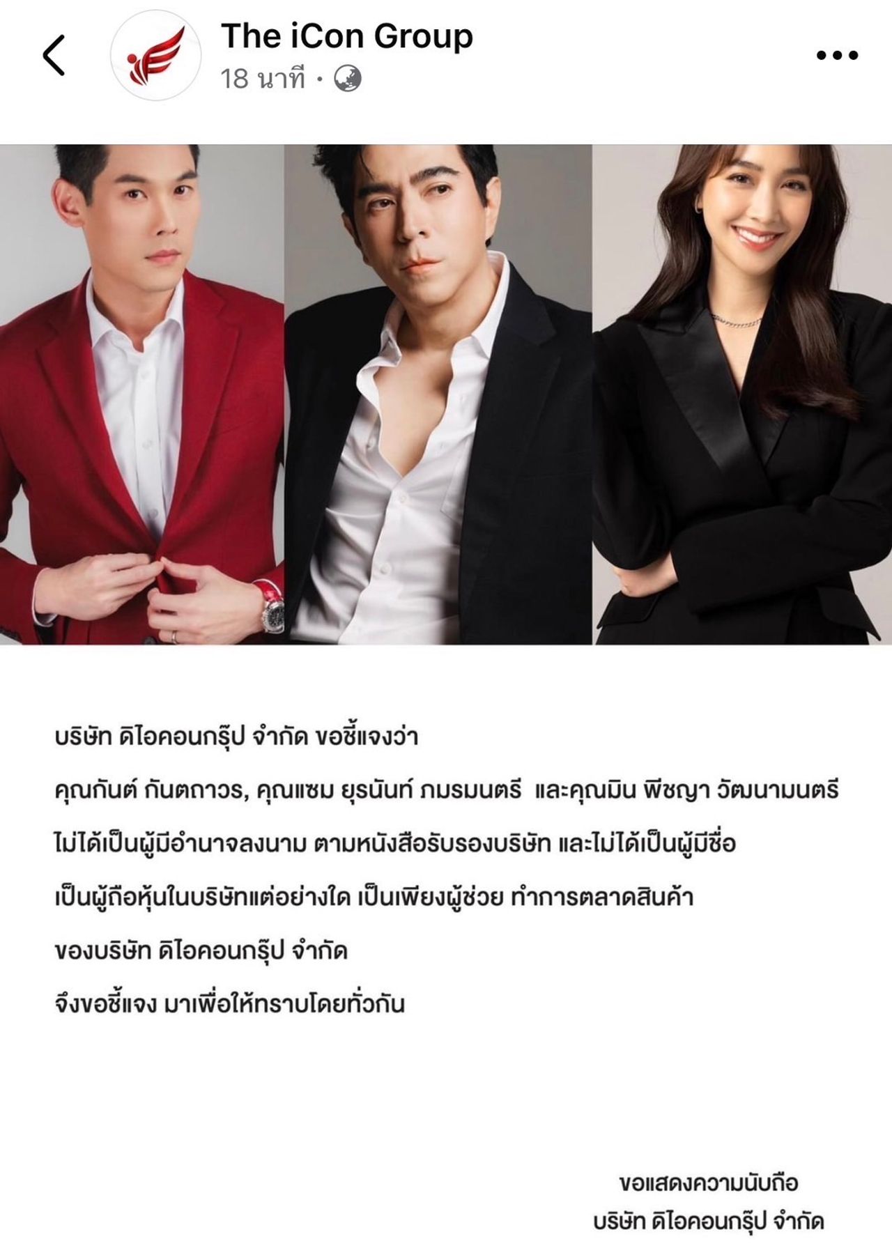 คุณกันต์ กันตถาวร, คุณแซม ยุรนันท์ ภมรมนตรี และคุณมิน พีชญา วัฒนามนตรี ไม่ได้เป็นผู้มีอำนาจลงนาม ตามหนังสือรับรองบริษัท และไม่ได้เป็นผู้มีชื่อเป็นผู้ถือหุ้นในบริษัทแต่อย่างใด เป็นเพียงผู้ช่วยทำการตลาดสินค้าของบริษัท ดิไอคอนกรุ๊ป จำกัด จึงขอชี้แจงมาเพื่อให้ทราบโดยทั่วกัน