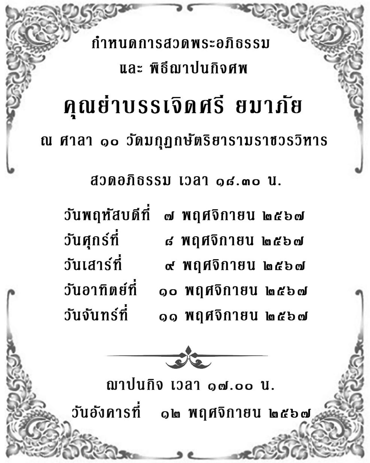 ทางครอบครัวได้เปิดเผยกำหนดการพิธีศพ คุณยายบรรเจิดศรี โดยมีพิธีสวดพระอภิธรรม ตั้งแต่วันที่ 7-11 พฤศจิกายน 2567 เวลา 18.30 น. ณ ศาลา 10 วัดมกุฏกษัตริยาราม และมีพิธีฌาปนกิจศพวันอังคารที่ 12 พฤศจิกายน 2567