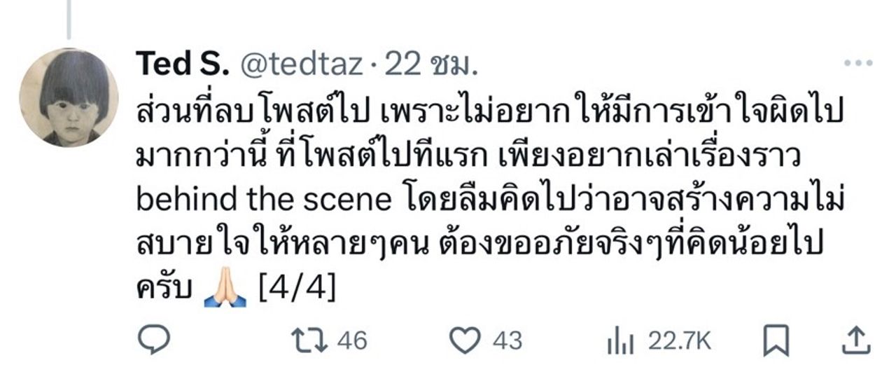 ส่วนที่ลบโพสต์ไป เพราะไม่อยากให้มีการเข้าใจผิดไปมากกว่านี้ ที่โพสต์ไปทีแรกเพียงอยากเล่าเรื่องราว behind the scene โดยลืมคิดไปว่าอาจสร้างความไม่สบายใจให้หลายๆ คน ต้องขออภัยจริงๆ ที่คิดน้อยไปครับ”