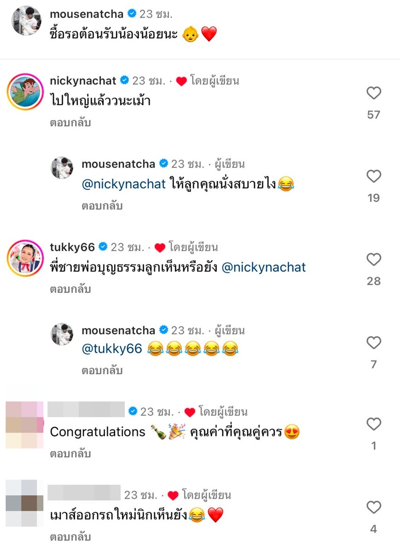 งานนี้ก็มีเพื่อนๆ แฟนๆ เข้ามาแสดงความยินดีมากมาย บ้างก็อดแซวไม่ได้ว่า นิกกี้ ณฉัตร พี่ชายของเม้าส์ เห็นแล้วหรือยัง แต่หลังจากนั้นไม่นาน นิกกี้ ก็เข้ามาคอมเมนต์ทันทีว่า “ไปใหญ่แล้ววนะเม้า” ซึ่ง เม้าส์ ก็รีบตอบกลับว่า “ให้ลูกคุณนั่งสบายไง”