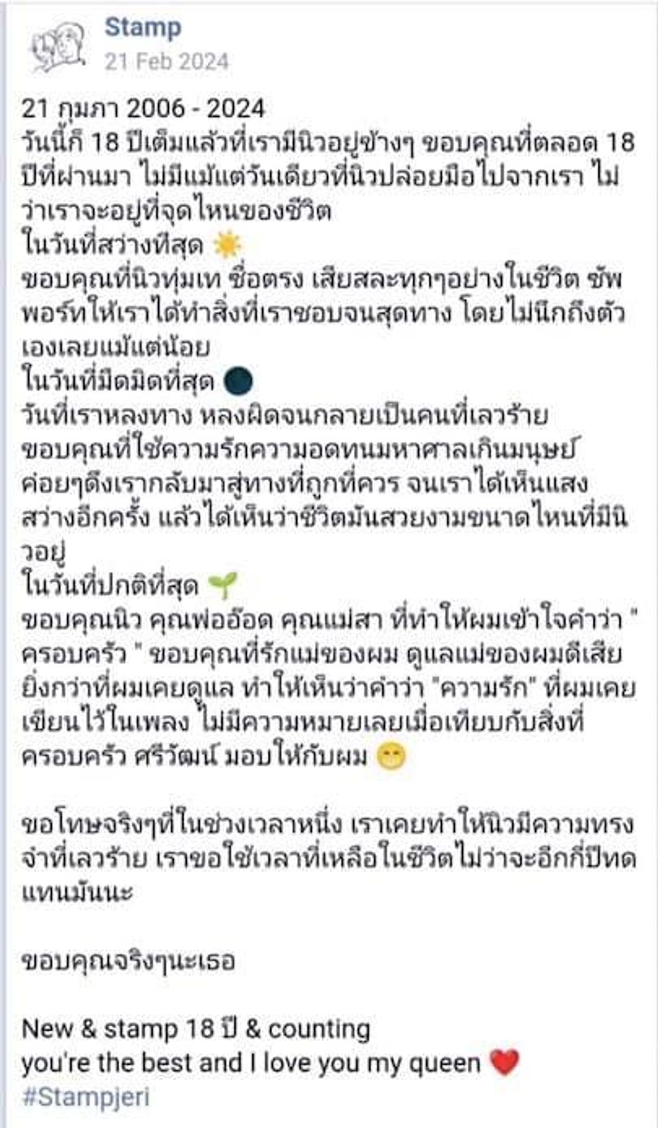 ขอบคุณจริงๆ นะเธอ New & stamp 18 ปี & counting you're the best and I love you my queen #Stampjeri”