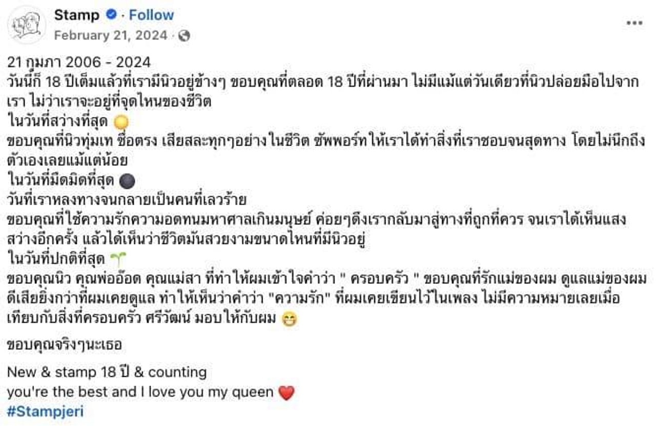 “21 กุมภา 2006 - 2024 วันนี้ก็ 18 ปีเต็มแล้วที่เรามีนิวอยู่ข้างๆ ขอบคุณที่ตลอด 18 ปีที่ผ่านมา ไม่มีแม้แต่วันเดียวที่นิวปล่อยมือไปจากเรา ไม่ว่าเราจะอยู่ที่จุดไหนของชีวิต ในวันที่สว่างที่สุด ขอบคุณที่นิวทุ่มเท ซื่อตรง เสียสละทุกๆ อย่างในชีวิต ซัพพอร์ตให้เราได้ทำสิ่งที่เราชอบจนสุดทาง โดยไม่นึกถึงตัวเองเลยแม้แต่น้อย ในวันที่มืดมิดที่สุด วันที่เราหลงทางจนกลายเป็นคนที่เลวร้าย ขอบคุณที่ใช้ความรักความอดทนมหาศาลเกินมนุษย์ ค่อยๆ ดึงเรากลับมาสู่ทางที่ถูกที่ควร จนเราได้เห็นแสงสว่างอีกครั้ง แล้วได้เห็นว่าชีวิตมันสวยงามขนาดไหนที่มีนิวอยู่ในวันที่ปกติที่สุด