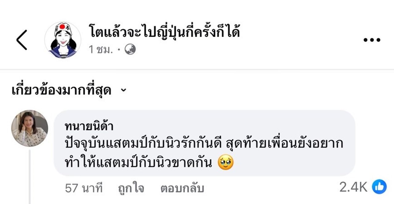 แต่หลังจากที่เพจดังกล่าวโพสต์ไป ทนายนิด้า ศรันยา หวังสุขเจริญ ทนายความของแสตมป์ ก็คอมเมนต์สวนกลับถึงประเด็นนี้ว่า “ปัจจุบันแสตมป์กับนิวรักกันดี สุดท้ายเพื่อนยังอยากทำให้แสตมป์กับนิวขาดกัน”ด้วย