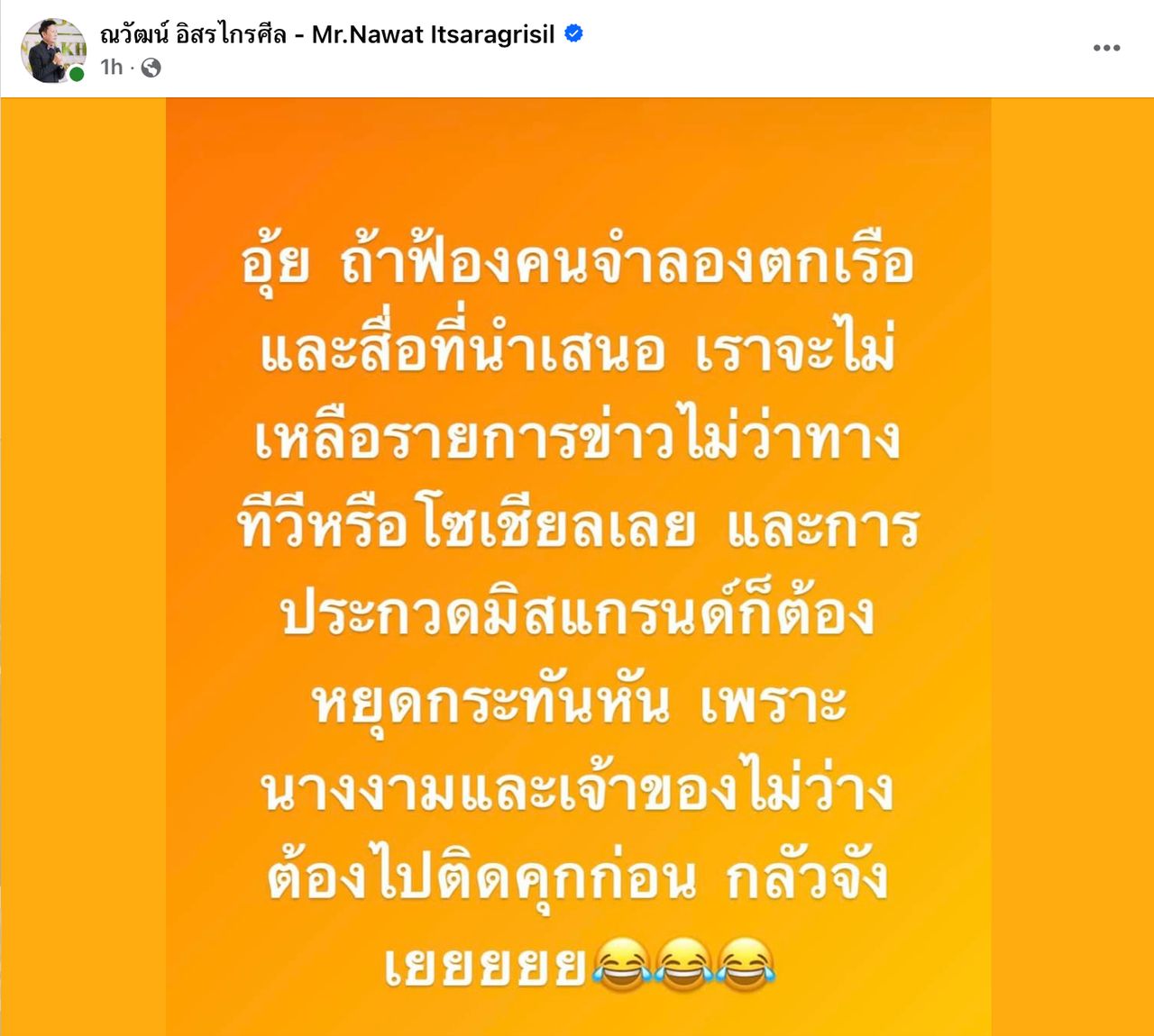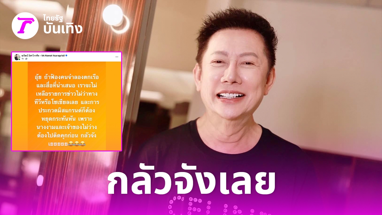 ล่าสุดวันนี้ (21 ม.ค. 2567) บอสณวัฒน์ ได้มีการเคลื่อนไหวผ่านทางเฟซบุ๊กส่วนตัวถึงเรื่องนี้ โดยบอกว่า “อุ้ย ถ้าฟ้องคนจำลองตกเรือ และสื่อที่นำเสนอ เราจะไม่เหลือรายการข่าวไม่ว่าทางทีวีหรือโซเชียลเลย และการประกวดมิสแกรนด์ก็ต้องหยุดกะทันหัน เพราะนางงามและเจ้าของไม่ว่าง ต้องไปติดคุกก่อน กลัวจังเยยยยย”