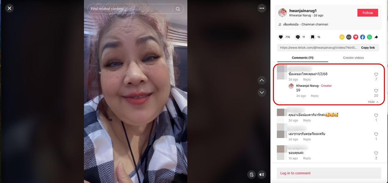 ล่าสุด ย่าเปิ้ล โพสต์คลิปลิปซิงก์ร้องเพลงลงใน TikTok @hwanjainarug1 เช่นเคย แต่งานนี้ก็มีชาวเน็ตรายหนึ่งเข้ามาคอมเมนต์ว่า “ซื้อเลขอะไรคะคุณย่า 1/2/68” งานนี้ย่าเปิ้ลเลยตอบกลับไปว่า “59”