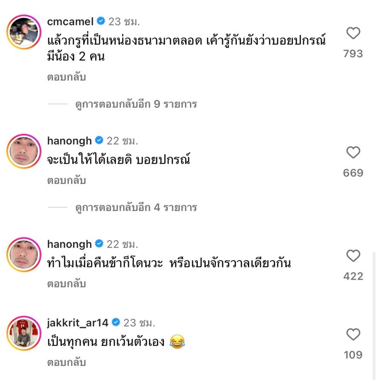 ส่องคอมเมนต์ก็มีแฟนๆ เข้ามาแซวเพียบ ด้านน้องๆ ของบอย ทั้ง หน่อง ธนา ก็เข้ามาแซวว่า “จะเป็นให้ได้เลยดิ บอยปกรณ์” และ “ทำไมเมื่อคืนข้าก็โดนวะ หรือเป็นจักรวาลเดียวกัน” ในขณะที่ ภัทร ก็บอกว่า “แล้วกรูที่เป็นหน่องธนามาตลอด เค้ารู้กันยังว่าบอยปกรณ์มีน้อง 2 คน” ด้านพระเอกหนุ่มตี๋ อาเล็ก ธีรเดช ก็บอกว่า “ล่าสุดผมเจอน้องสองคน คุยกันจังหวะที่กำลังจะเดินสวนกับผมว่า มึง คนนี้หน้าเหมือนอาเล็กธีรเดชเลย”