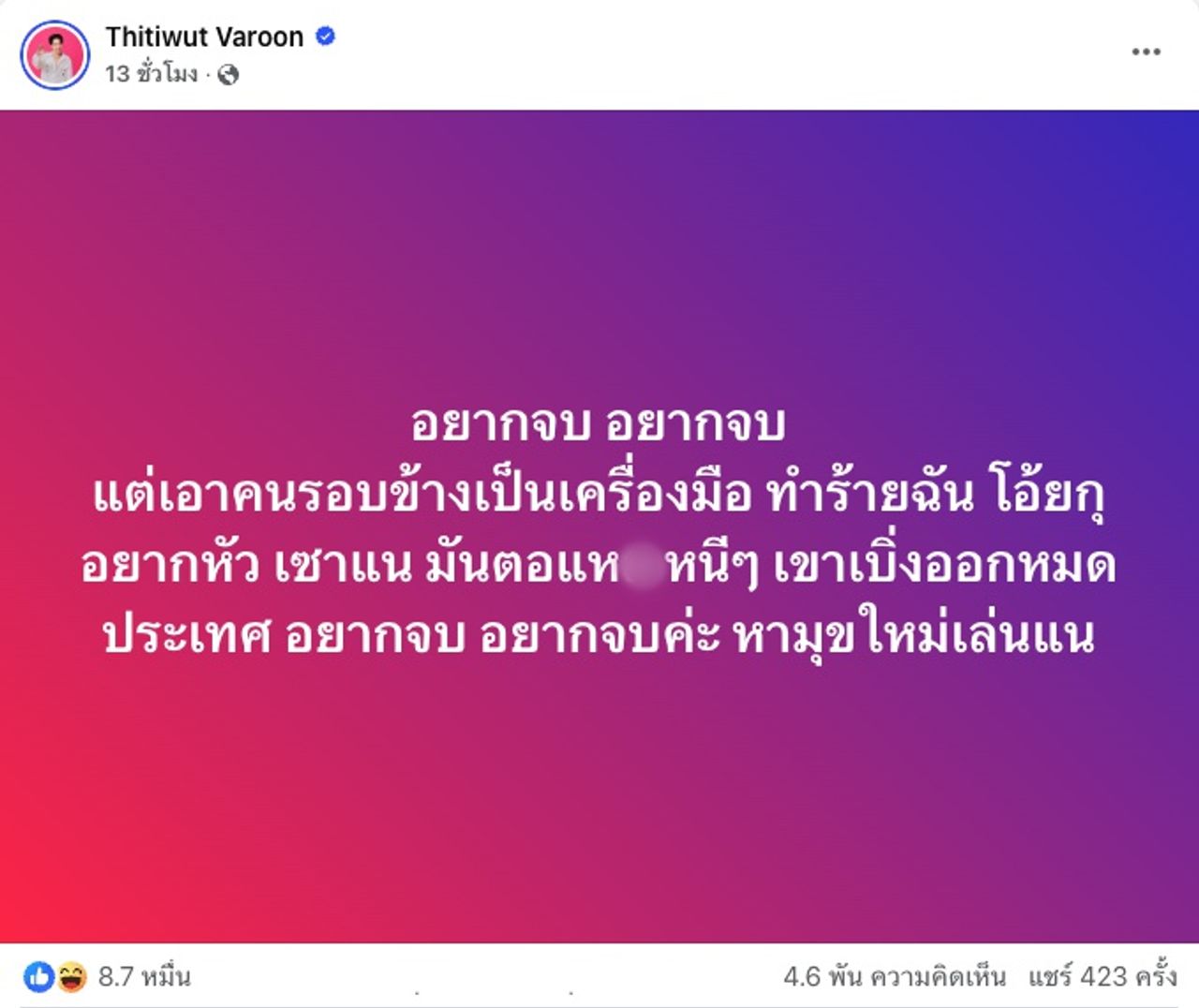 โดยในเฟซบุ๊ก Thitiwut Varoon โพสต์ข้อความเดือดถึงใครบางคนไว้ว่า “อยากจบ อยากจบ แต่เอาคนรอบข้างเป็นเครื่องมือ ทำร้ายฉัน โอ้ยกุอยากหัว เซาแน มันตอแหx หนีๆ เขาเบิ่งออกหมดประเทศ อยากจบ อยากจบค่ะ หามุขใหม่เล่นแน”
