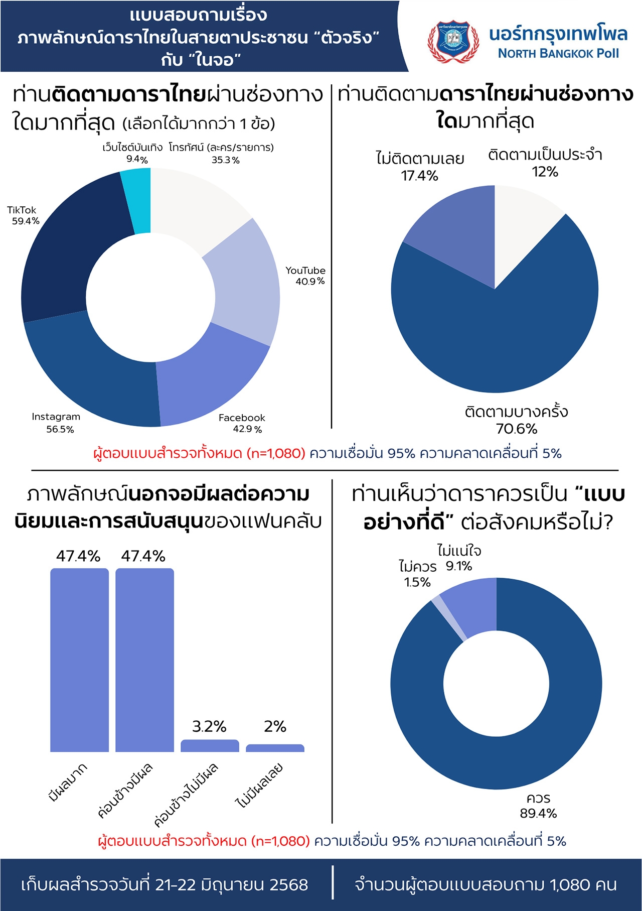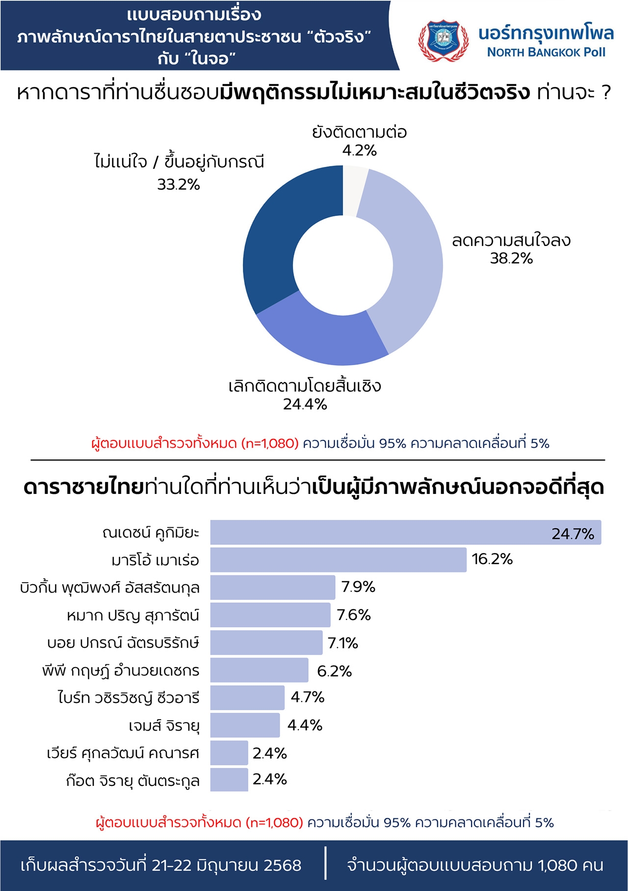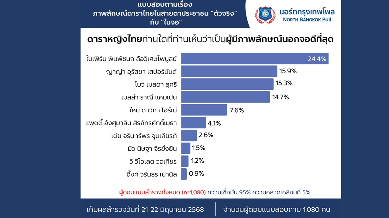 ผศ.ดร.สานิต ศิริวิศิษฐ์กุล หัวหน้าศูนย์สำรวจความคิดเห็นนอร์ทกรุงเทพโพล สำนักวิจัย มหาวิทยาลัยนอร์ทกรุงเทพ เปิดเผยว่า จากการสำรวจความคิดเห็นของประชาชนในประเด็นภาพลักษณ์ดาราไทยในสายตาประชาชน “ตัวจริง” กับ “ในจอ” ระหว่างวันที่ 21 - 22 มิถุนายน 2568 จากจำนวน 1,080 ตัวอย่าง โดยเป็นประชาชนทุกช่วงอายุจากทุกภูมิภาคทั่วประเทศ ที่ค่าความเชื่อมั่นร้อยละ 95