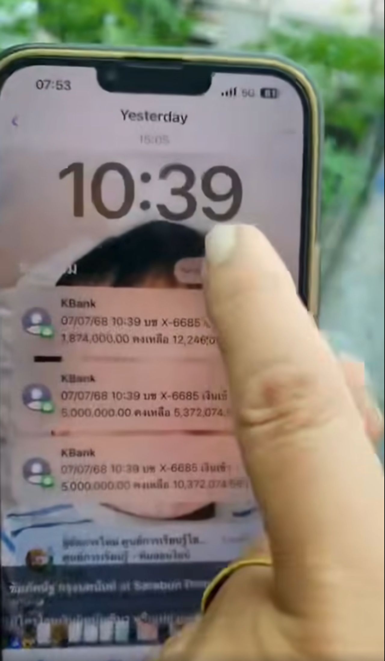- ในภาพเป็นการแจ้งโอนเงินเข้าบัญชี มีเงินเข้ามาหลักล้าน โดยระบุเวลา 07/07/68 เวลา 10.39 น. มีโอนยอดมา 5 ล้าน 2 ยอด และอีก 1.8 ล้าน อีก 1 ยอด รวมเป็น 3 ยอด