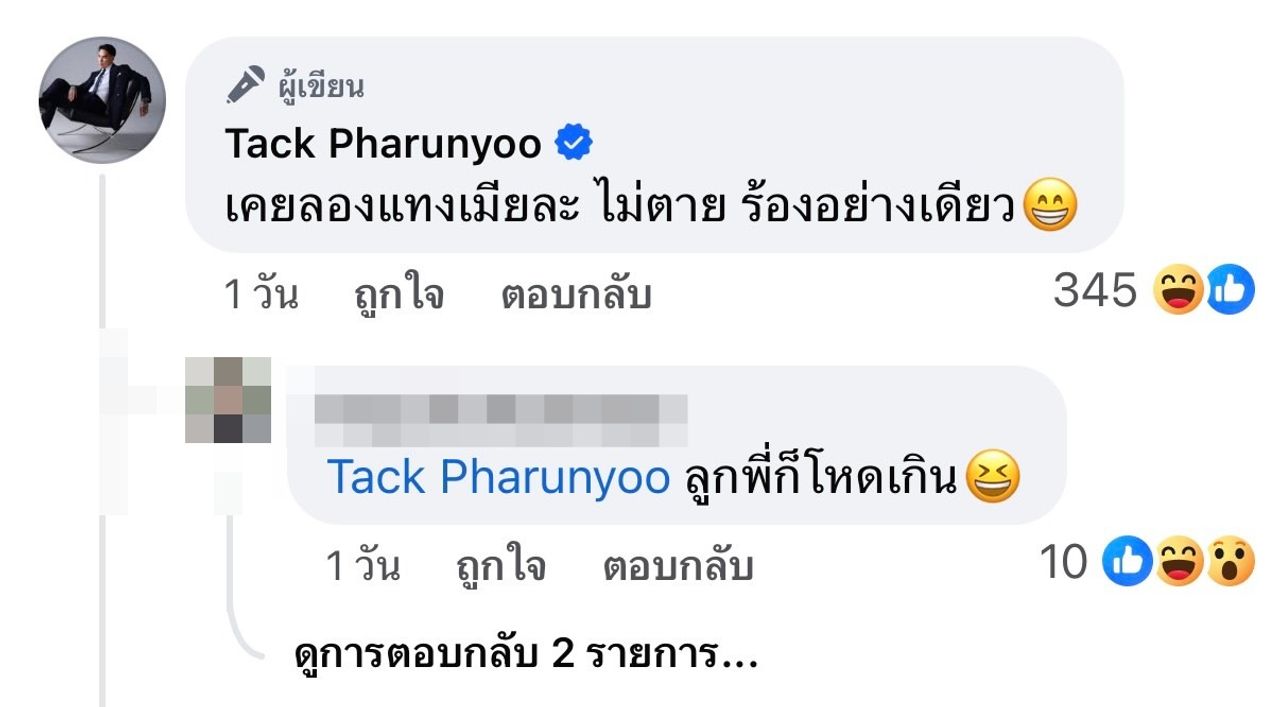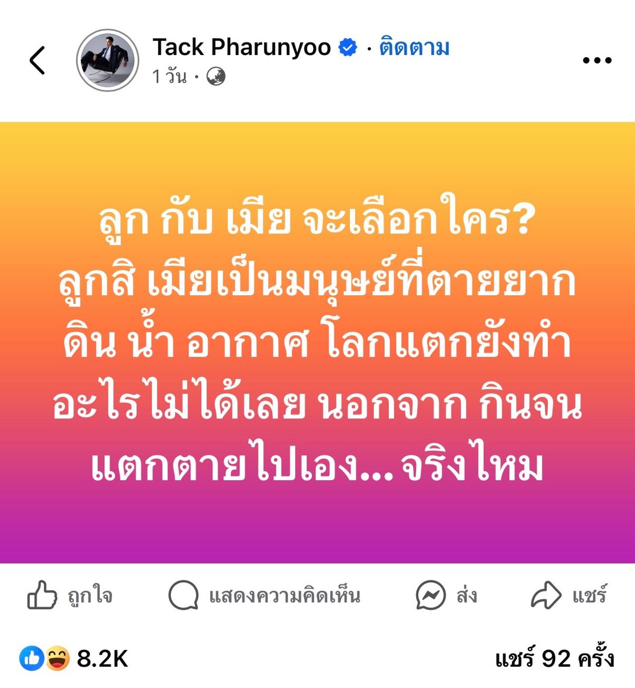 "ลูกกับเมีย จะเลือกใคร? ลูกสิ เมียเป็นมนุษย์ที่ตายยาก ดิน น้ำ อากาศ โลกแตกยังทำอะไรไม่ได้เลย นอกจากกินจนแตกตายไปเอง... จริงไหม" นอกจากนี้ แทคยังคอมเมนต์ใต้โพสต์ดังกล่าวว่า "เคยลองแทงเมียละ ไม่ตาย ร้องอย่างเดียว, ตกน้ำแม่_ก็ไม่จม มีห่วงยางเป็นของตัวเอง, เมียจะตายต่อเมื่อของกินหมดโลก"