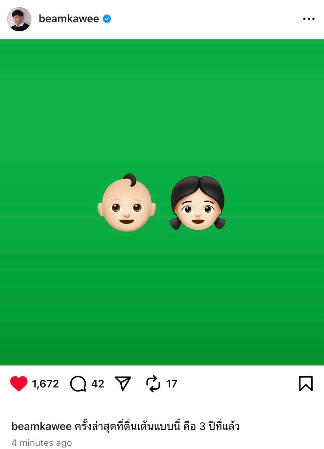 ทำเอาโซเชียลแทบระเบิด เมื่อนักร้อง-นักแสดง บีม กวี คุณพ่อลูก 4 ที่จู่ๆ ก็ได้โพสต์อีโมจิรูปเด็กผู้ชายและเด็กผู้หญิง พร้อมแคปชั่นลงในอินสตาแกรมของตัวเองว่า "ครั้งล่าสุดที่ตื่นเต้นแบบนี้ คือ 3 ปีที่แล้ว"