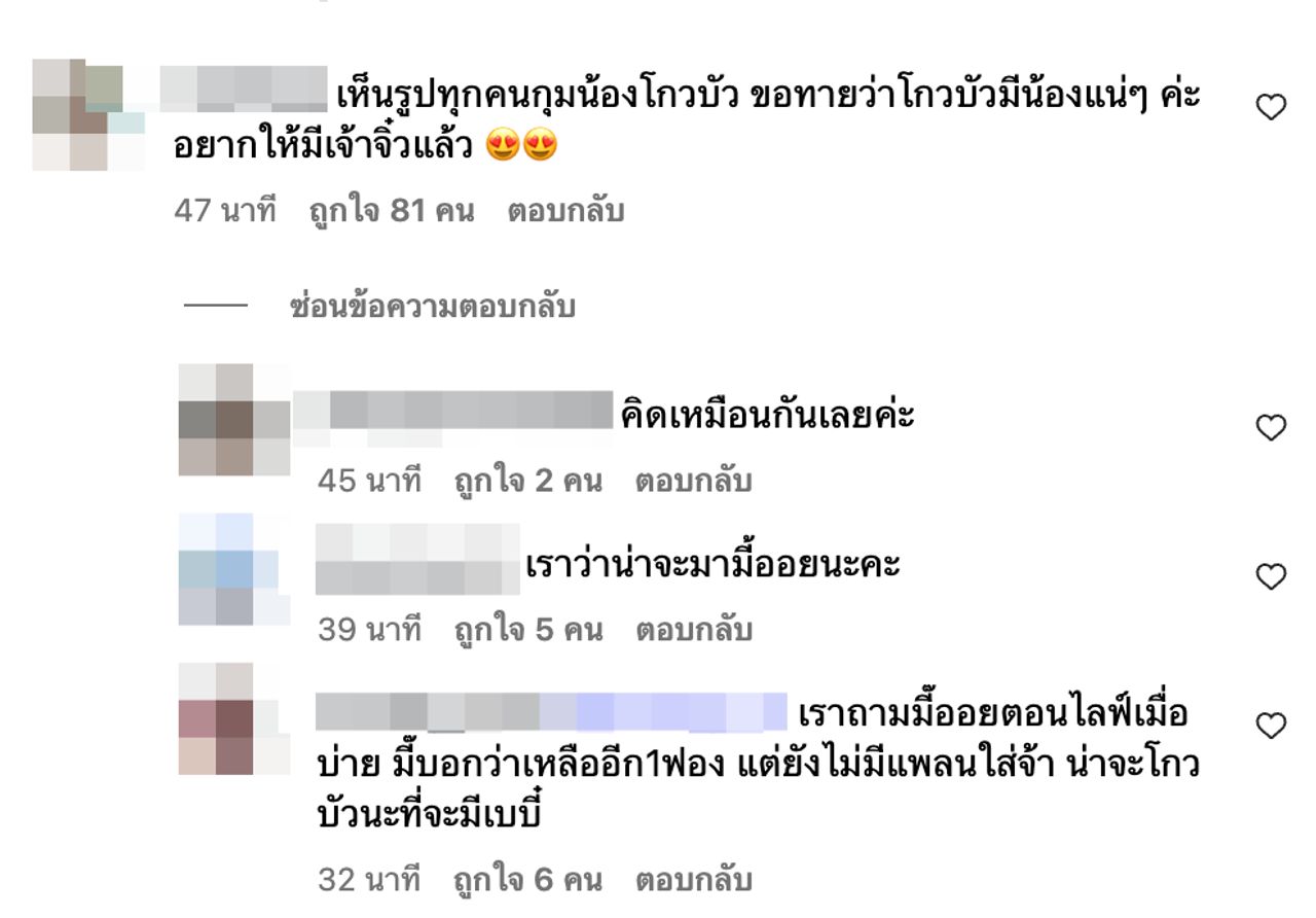งานนี้ทำเอาเพื่อนพี่น้องทั้งในและนอกวงการ พร้อมทั้งแฟนๆ เข้ามากดไลก์และคอมเมนต์ถามด้วยความสงสัย บ้างก็บอกรอฟังข่าวดีจากพ่อพ่อ แต่แฟนคลับบางคนก็บอกว่า "เห็นรูปทุกคนกุมน้องโกวบัว ขอทายว่าโกวบัวมีน้องแน่ๆ ค่ะ อยากให้มีเจ้าจิ๋วแล้ว" และ "เราถามมี๊ออยตอนไลฟ์เมื่อบ่าย มี๊บอกว่าเหลืออีก 1 ฟอง แต่ยังไม่มีแพลนใส่จ้า น่าจะโกวบัวนะที่จะมีเบบี้"