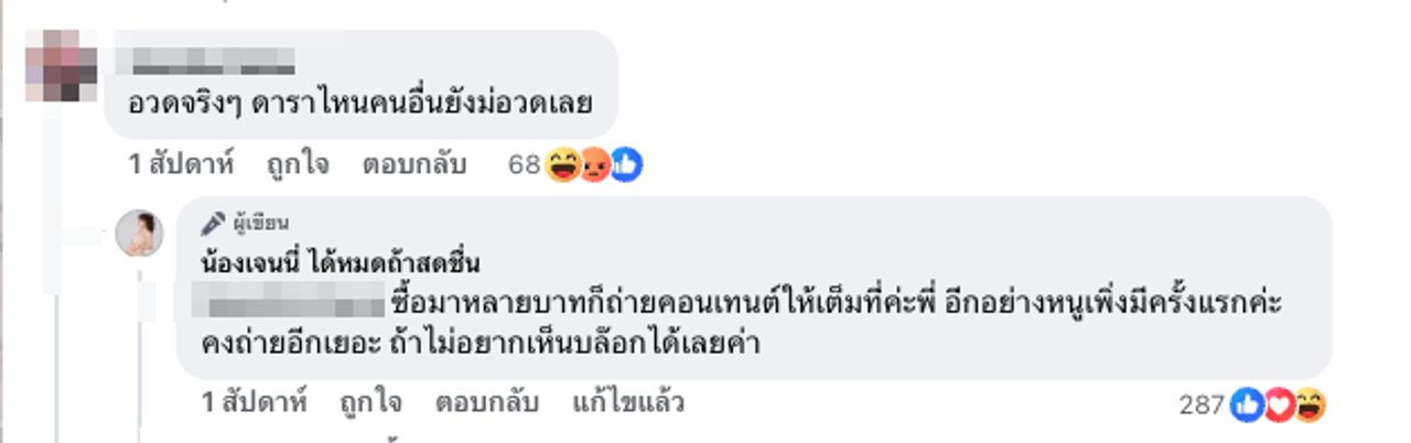 แต่งานนี้กลับมีชาวเน็ตรายหนึ่งเข้ามาคอมเมนต์แซะเจนนี่ว่าอวดรวยในคลิปดังกล่าวว่า "อวดจริงๆ ดาราไหนคนอื่นยังไม่อวดเลย" งานนี้เจนนี่ไม่ปล่อยให้คอมเมนต์ผ่านเลยไป เจ้าตัวได้เข้ามาตอบแบบจึ้งๆ ว่า "ซื้อมาหลายบาทก็ถ่ายคอนเทนต์ให้เต็มที่ค่ะพี่ อีกอย่างหนูเพิ่งมีครั้งแรกค่ะ คงถ่ายอีกเยอะ ถ้าไม่อยากเห็นบล๊อกได้เลยค่า" และนอกจากเจนนี่จะตอบกลับแล้ว ยังมีชาวเน็ตอีกหลายคนเข้ามาคอมเมนต์ตอบกลับแบบเผ็ดร้อนถึงชาวเน็ตคนดังกล่าวอีกด้วย