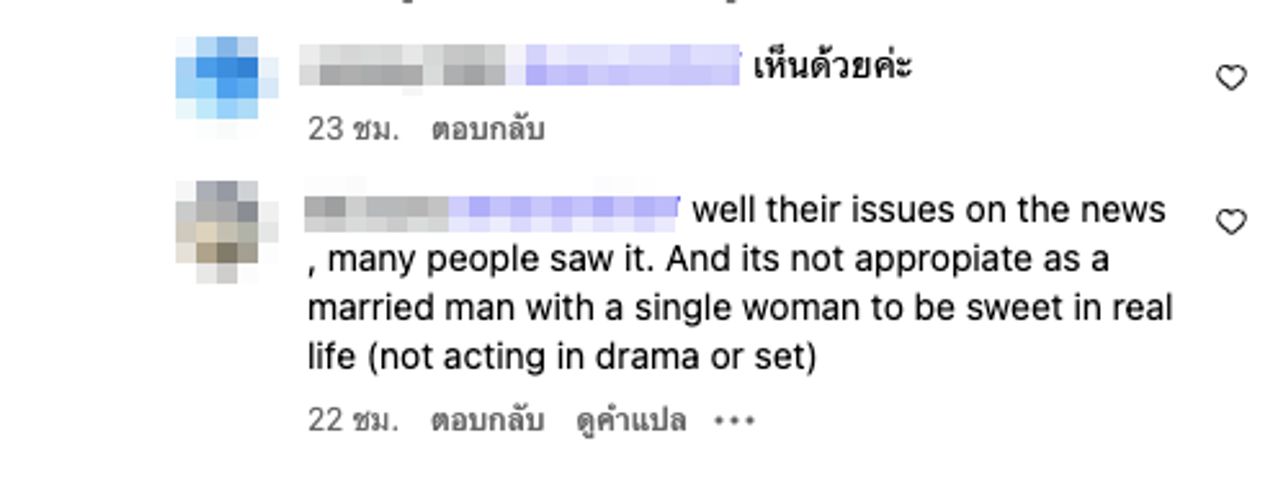 แต่ก็ดูเหมือนว่าอินเตอร์แฟนจะยังไม่เข้าใจ เข้ามาคอมเมนต์ต่อทันทีว่า หลายคนเห็นคลิปดังกล่าว และมันดูไม่เหมาะที่ผู้ชายที่แต่งงานแล้วกับผู้หญิงโสดจะโชว์หวานในชีวิตจริง ที่ไม่ใช่การแสดง
