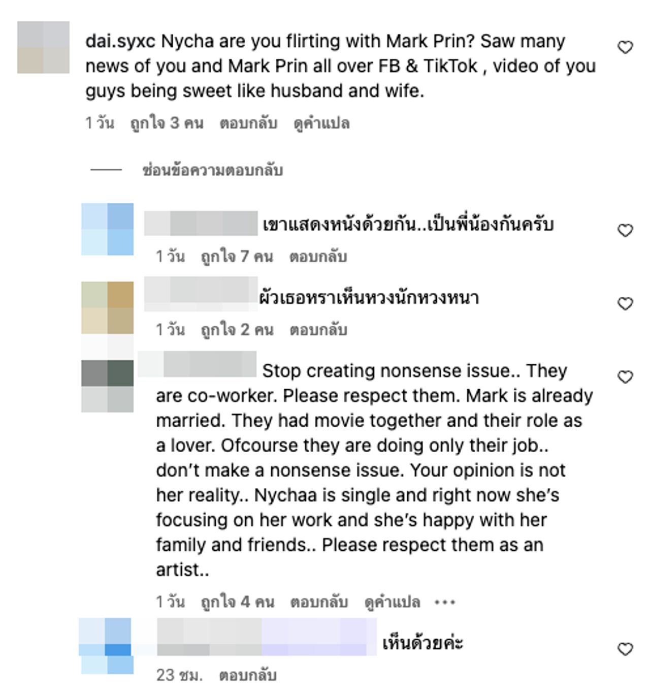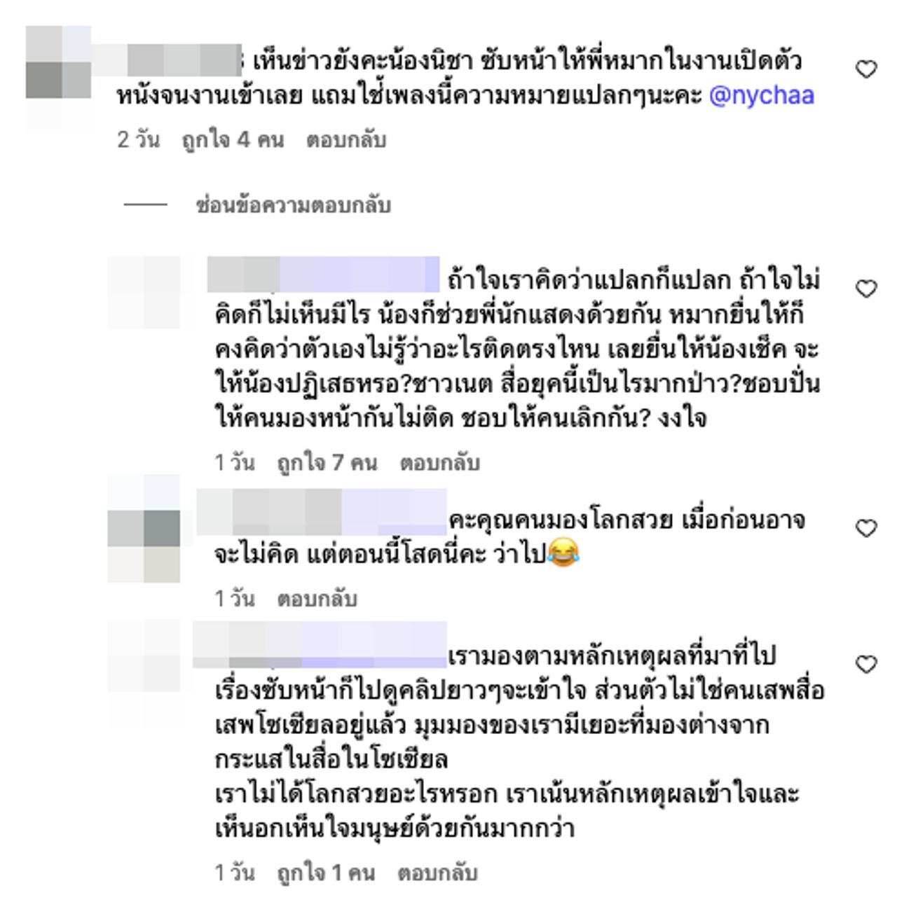 ซึ่งแฟนไทยก็เข้าไปอธิบายว่าทั้งคู่นั้นเล่นหนังด้วยกัน เป็นแค่เพื่อนร่วมงานกัน ตอนนี้ณิชาโสด และกำลังโฟกัสเรื่องงาน โปรดเคารพพวกเขาในฐานะศิลปิน