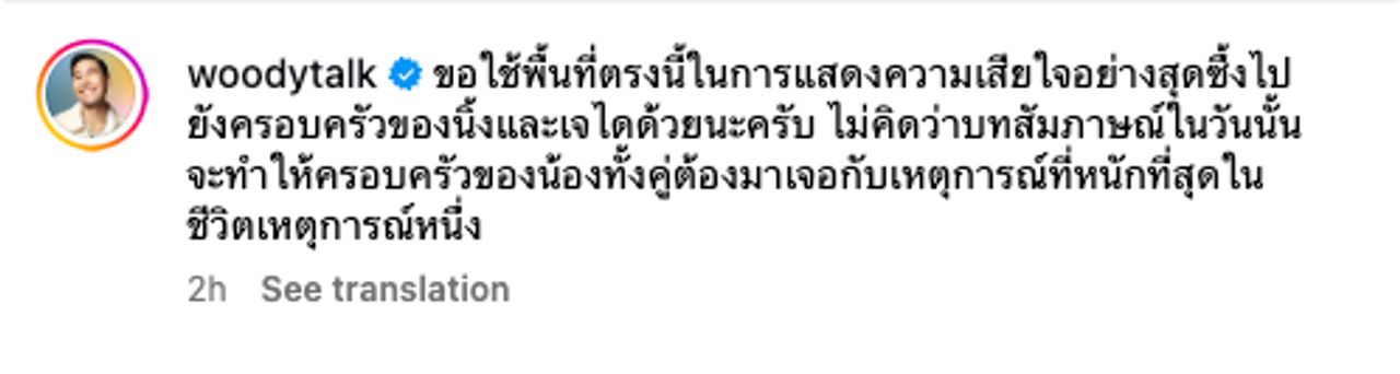 พร้อมเขียนแคปชั่นว่า “ขอใช้พื้นที่ตรงนี้ในการแสดงความเสียใจอย่างสุดซึ้งไปยังครอบครัวของนิ้งและเจไดด้วยนะครับ ไม่คิดว่าบทสัมภาษณ์ในวันนั้นจะทำให้ครอบครัวของน้องทั้งคู่ต้องมาเจอกับเหตุการณ์ที่หนักที่สุดในชีวิตเหตุการณ์หนึ่ง”