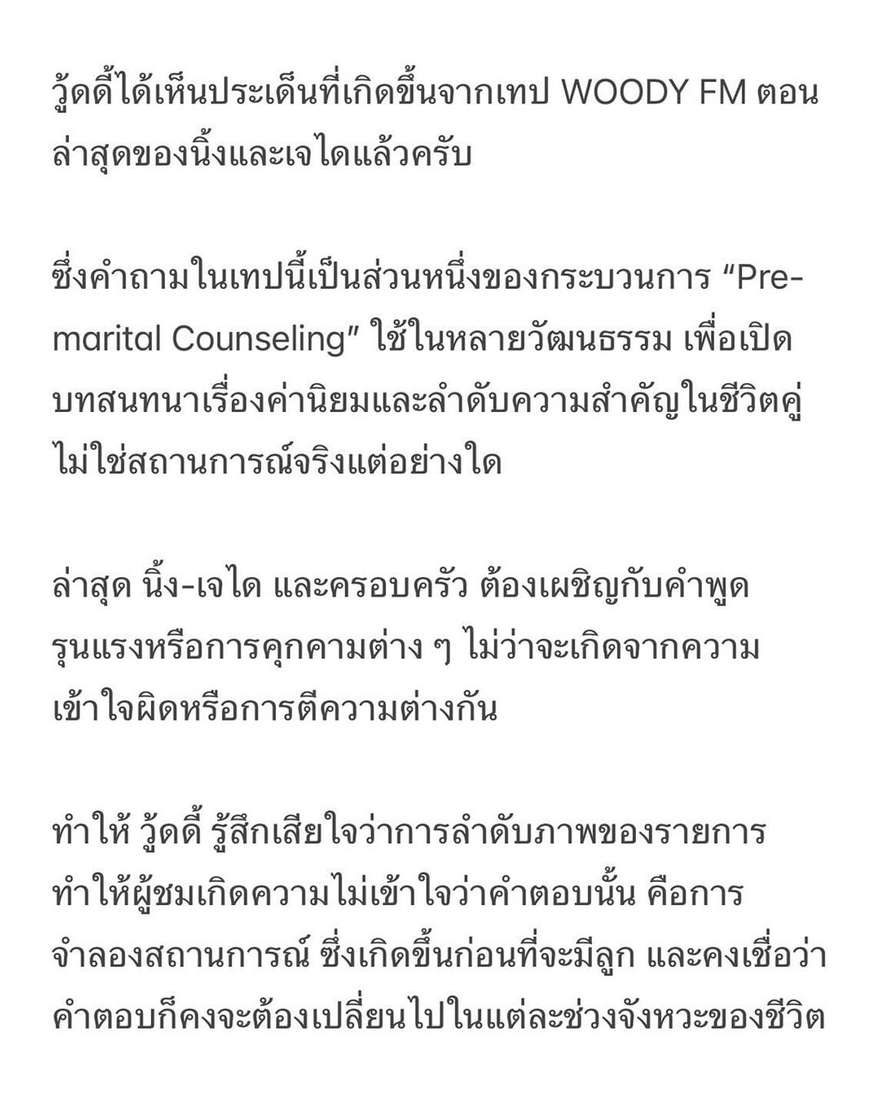 “วู้ดดี้ได้เห็นประเด็นที่เกิดขึ้นจากเทป วู้ดดี้ เอฟเอ็ม ตอนล่าสุดของนิ้งและเจไดแล้วครับ ซึ่งคำถามในเทปนี้เป็นส่วนหนึ่งของกระบวนการ Pre-marital Counseling ใช้ในหลายวัฒนธรรมเพื่อเปิดบทสนทนาเรื่องค่านิยมและลำดับความสำคัญในชีวิตคู่ ไม่ใช่สถานการณ์จริงแต่อย่างใด