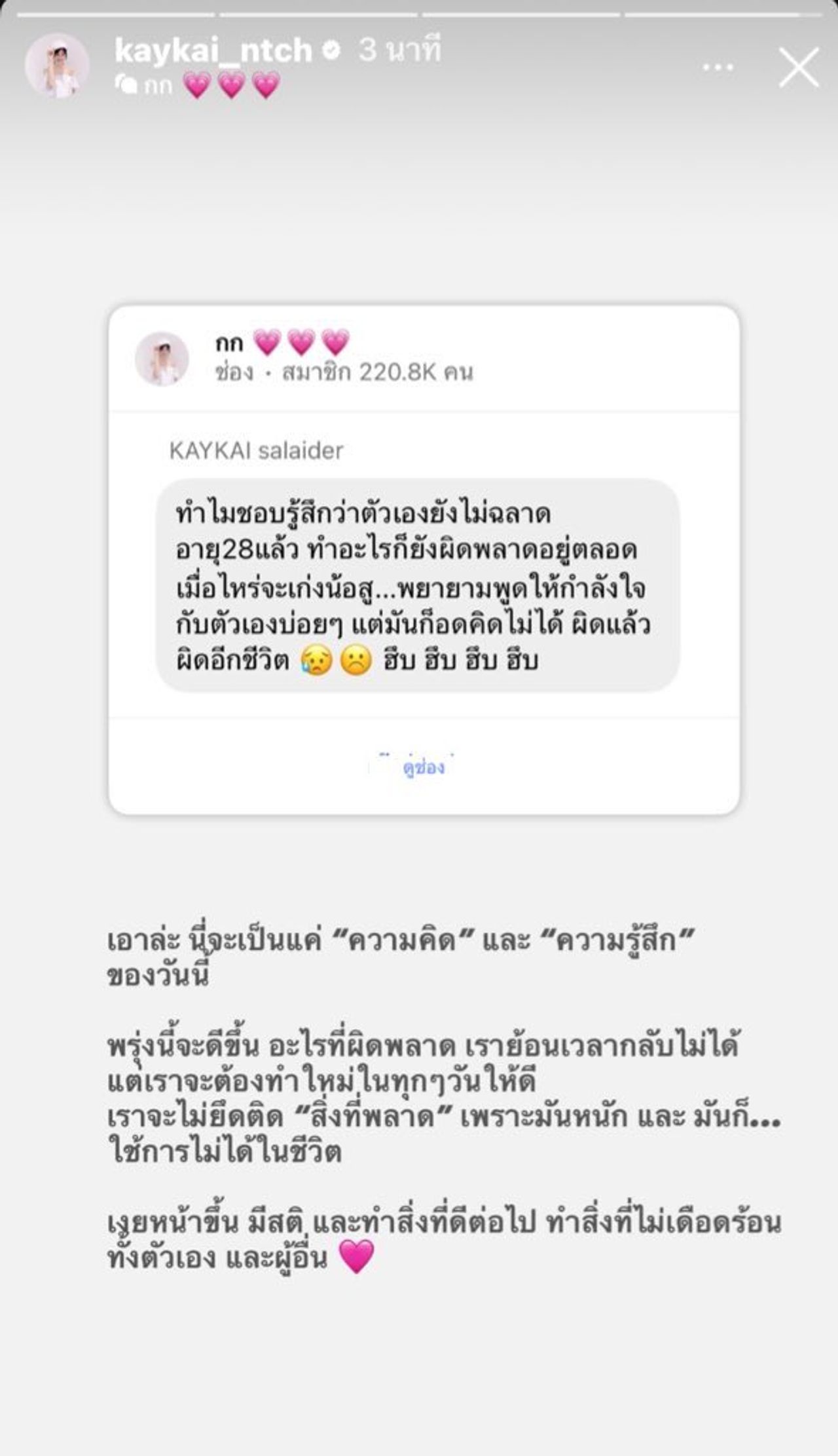 นอกจากนี้เจ้าตัวยังแชร์มาที่สตอรี่ พร้อมเขียนข้อความว่า "เอาล่ะ นี่จะเป็นแค่ “ความคิด” และ “ความรู้สึก” ของวันนี้ พรุ่งนี้จะดีขึ้น อะไรที่ผิดพลาด เราย้อนเวลากลับไม่ได้ แต่เราจะต้องทำใหม่ในทุกๆวันให้ดี เราจะไม่ยึดติด “สิ่งที่พลาด” เพราะมันหนัก และ มันก็… ใช้การไม่ได้ในชีวิต เงยหน้าขึ้น มีสติ, และทำสิ่งที่ดีต่อไป ทำสิ่งที่ไม่เดือดร้อน ทั้งตัวเอง และผู้อื่น"
