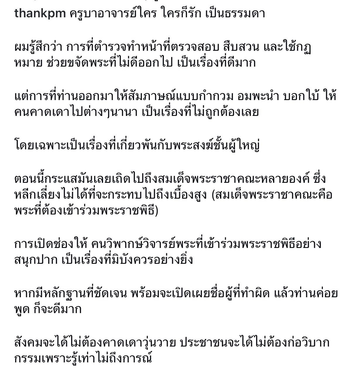 "ครูบาอาจารย์ใคร ใครก็รัก เป็นธรรมดา ผมรู้สึกว่า การที่ตำรวจทำหน้าที่ตรวจสอบ สืบสวน และใช้กฎหมาย ช่วยขจัดพระที่ไม่ดีออกไป เป็นเรื่องที่ดีมาก แต่การที่ท่านออกมาให้สัมภาษณ์แบบกำกวม อมพะนำ บอกใบ้ ให้คนคาดเดาไปต่างๆ นานา เป็นเรื่องที่ไม่ถูกต้องเลย โดยเฉพาะเป็นเรื่องที่เกี่ยวพันกับพระสงฆ์ชั้นผู้ใหญ่
