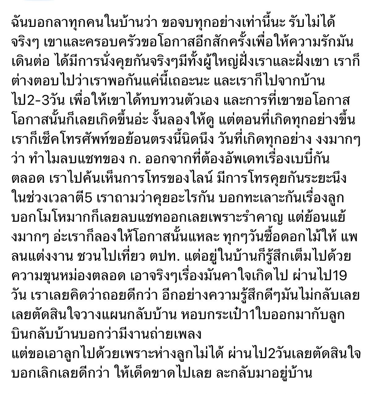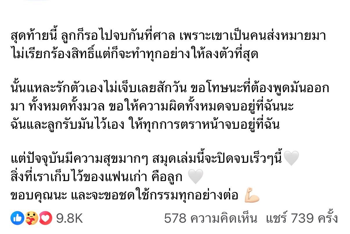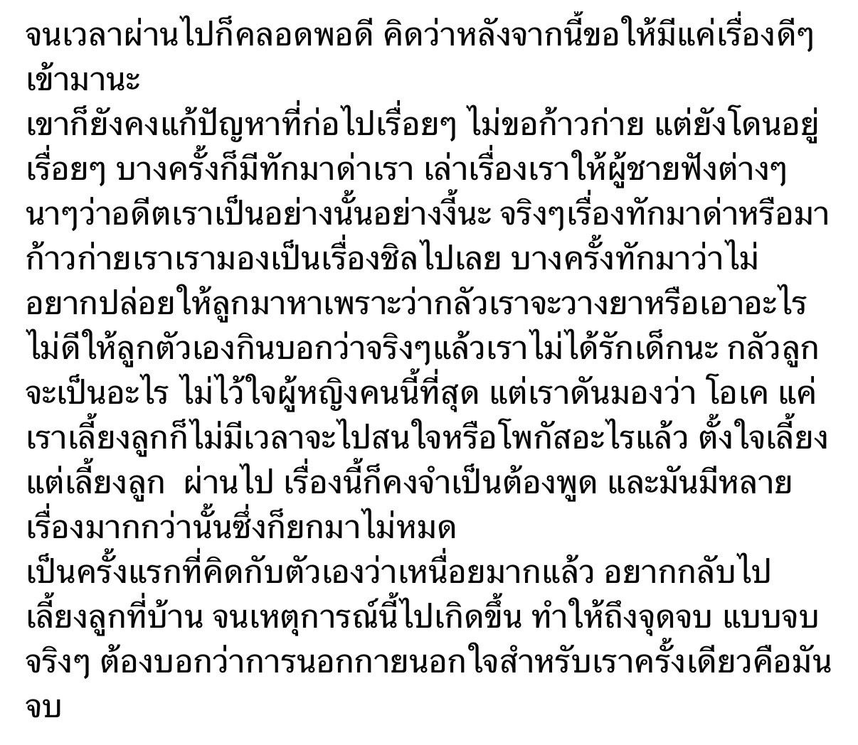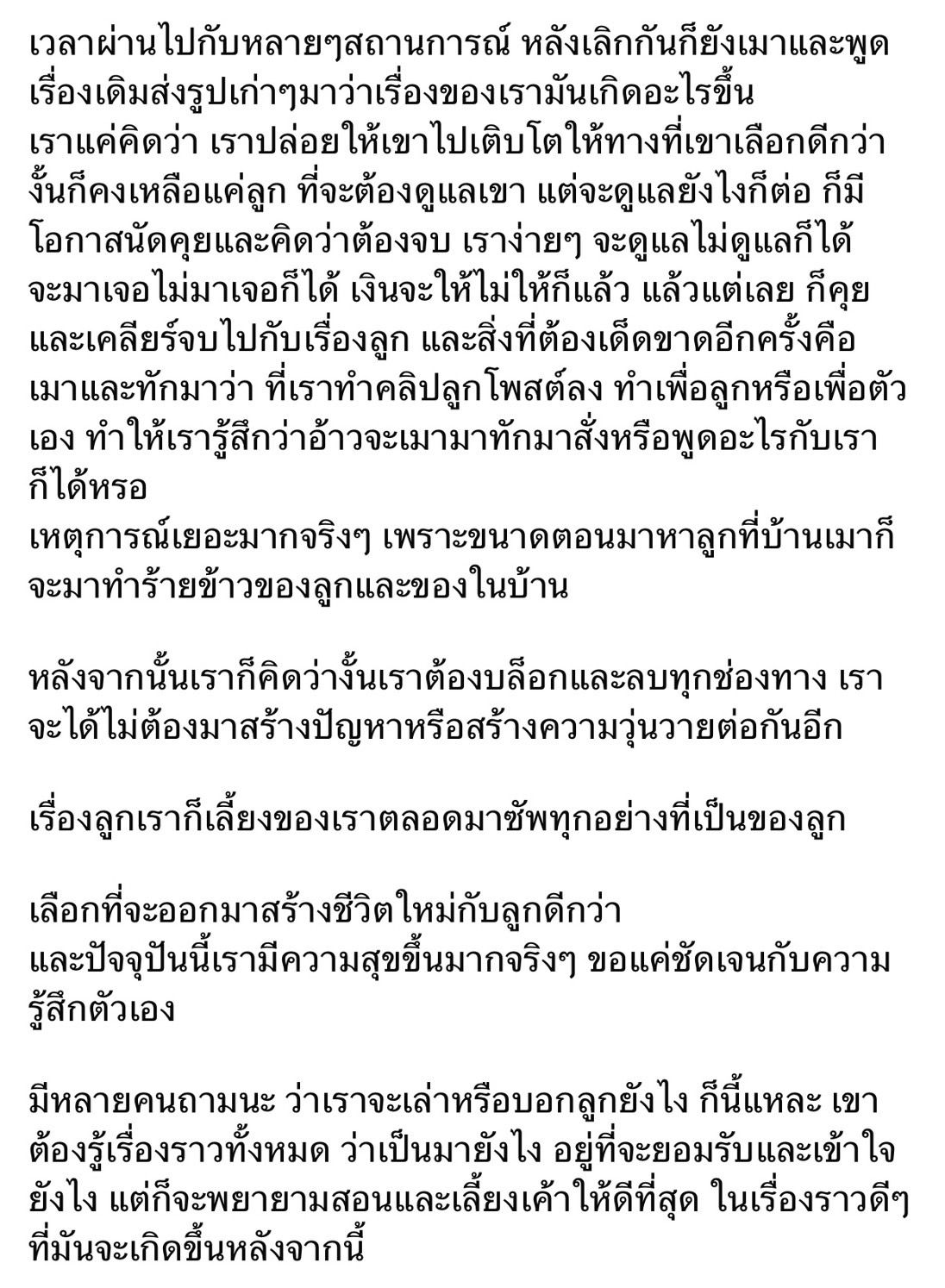 หลังจากนั้นเราก็คิดว่างั้นเราต้องบล็อกและลบทุกช่องทาง เราจะได้ไม่ต้องมาสร้างปัญหาหรือสร้างความวุ่นวายต่อกันอีก เรื่องลูกเราก็เลี้ยงของเราตลอดซัพพอร์ตทุกอย่างที่เป็นของลูก เลือกที่จะออกมาสร้างชีวิตใหม่กับลูกดีกว่า และปัจจุบันนี้เรามีความสุขขึ้นมากจริงๆ ขอแค่ชัดเจนกับความรู้สึกตัวเองมีหลายคนถามนะว่าเราจะเล่าหรือบอกลูกยังไง ก็นี่แหละ เขาต้องรู้เรื่องราวทั้งหมด ว่าเป็นมายังไง อยู่ที่จะยอมรับและเข้าใจยังไง แต่ก็จะพยายามสอนและเลี้ยงเขาให้ดีที่สุด ในเรื่องราวดีๆ ที่มันจะเกิดขึ้นหลังจากนี้สุดท้ายนี้ ลูกก็รอไปจบกันที่ศาล เพราะเขาเป็นคนส่งหมายมา ไม่เรียกร้องสิทธิ์แต่ก็จะทำทุกอย่างให้ลงตัวที่สุดนั่นแหละรักตัวเองไม่เจ็บเลยสักวัน ขอโทษนะที่ต้องพูดมันออกมา ทั้งหมดทั้งมวล ขอให้ความผิดทั้งหมดจบอยู่ที่ฉันนะ ฉันและลูกรับมันไว้เอง ให้ทุกการตราหน้าจบอยู่ที่ฉันแต่ปัจจุบันมีความสุขมากๆ สมุดเล่มนี้จะปิดจบเร็วๆ นี้สิ่งที่เราเก็บไว้ของแฟนเก่า คือลูก ขอบคุณนะ และจะขอชดใช้กรรมทุกอย่างต่อ"