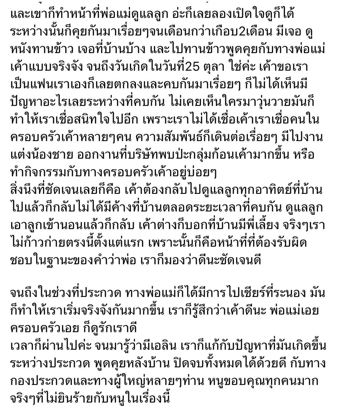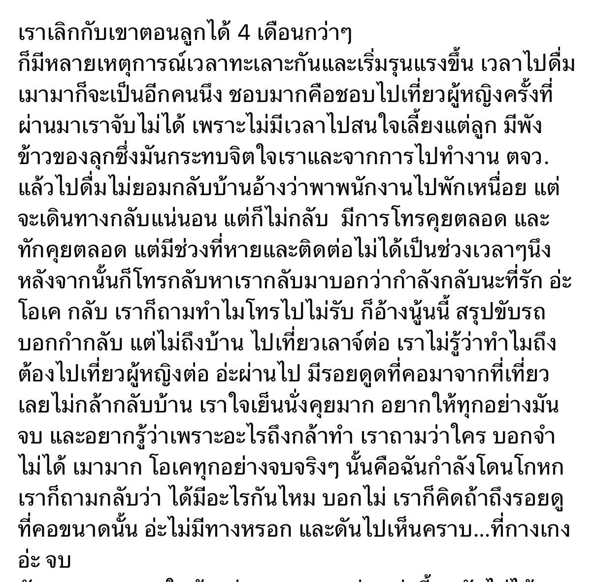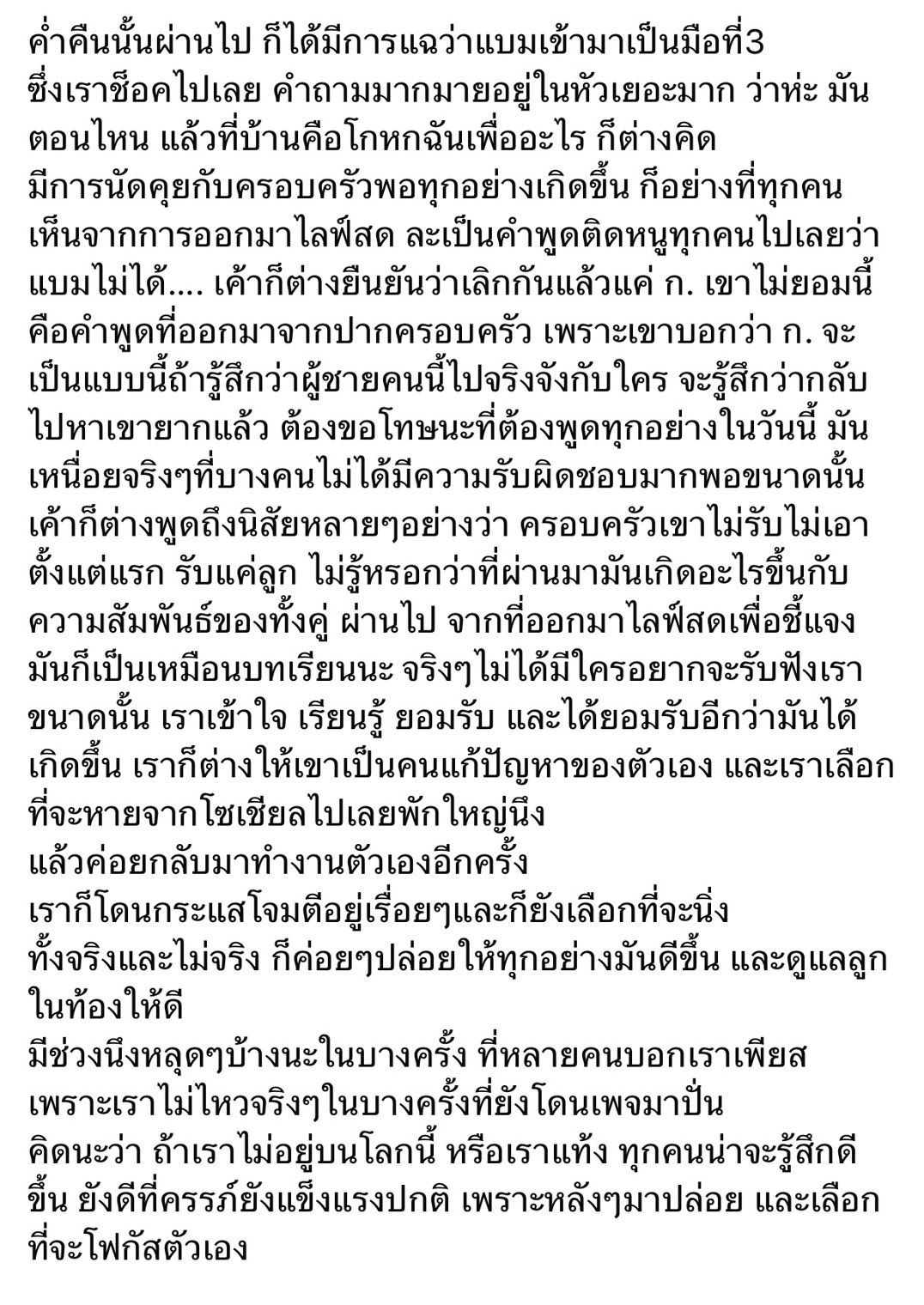 หลังจากนั้นเราก็คิดว่างั้นเราต้องบล็อกและลบทุกช่องทาง เราจะได้ไม่ต้องมาสร้างปัญหาหรือสร้างความวุ่นวายต่อกันอีก เรื่องลูกเราก็เลี้ยงของเราตลอดซัพพอร์ตทุกอย่างที่เป็นของลูก เลือกที่จะออกมาสร้างชีวิตใหม่กับลูกดีกว่า และปัจจุบันนี้เรามีความสุขขึ้นมากจริงๆ ขอแค่ชัดเจนกับความรู้สึกตัวเองมีหลายคนถามนะว่าเราจะเล่าหรือบอกลูกยังไง ก็นี่แหละ เขาต้องรู้เรื่องราวทั้งหมด ว่าเป็นมายังไง อยู่ที่จะยอมรับและเข้าใจยังไง แต่ก็จะพยายามสอนและเลี้ยงเขาให้ดีที่สุด ในเรื่องราวดีๆ ที่มันจะเกิดขึ้นหลังจากนี้สุดท้ายนี้ ลูกก็รอไปจบกันที่ศาล เพราะเขาเป็นคนส่งหมายมา ไม่เรียกร้องสิทธิ์แต่ก็จะทำทุกอย่างให้ลงตัวที่สุดนั่นแหละรักตัวเองไม่เจ็บเลยสักวัน ขอโทษนะที่ต้องพูดมันออกมา ทั้งหมดทั้งมวล ขอให้ความผิดทั้งหมดจบอยู่ที่ฉันนะ ฉันและลูกรับมันไว้เอง ให้ทุกการตราหน้าจบอยู่ที่ฉันแต่ปัจจุบันมีความสุขมากๆ สมุดเล่มนี้จะปิดจบเร็วๆ นี้สิ่งที่เราเก็บไว้ของแฟนเก่า คือลูก ขอบคุณนะ และจะขอชดใช้กรรมทุกอย่างต่อ"