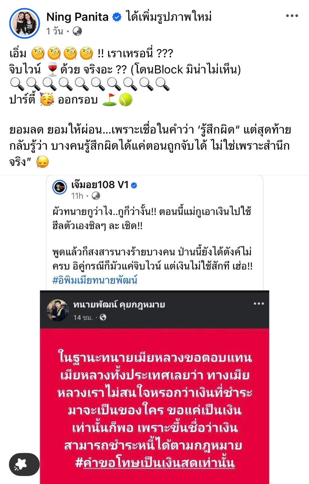 ทำเอาหลายคนอยากรู้ไม่น้อย เมื่อ เพจดังอย่าง เจ๊มอย 108 ได้แชร์ข้อความของทนายพัฒน์ ทนายเมียหลวง ที่โพสต์ข้อความเอาไว้ว่า "ในฐานะทนายเมียหลวง ขอตอบแทนเมียหลวงทั้งประเทศเลยว่า ทางเมียหลวงเราไม่สนใจหรอกว่าเงินที่ชำระมาจะเป็นเงินของใคร ขอแค่เป็นเงินก็พอ เพราะขึ้นชื่อว่าเงินชำระหนี้ได้ตามกฎหมาย #คำขอโทษเป็นเงินสดเท่านั้น"