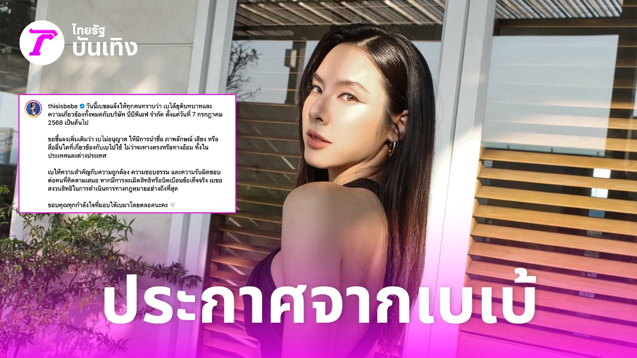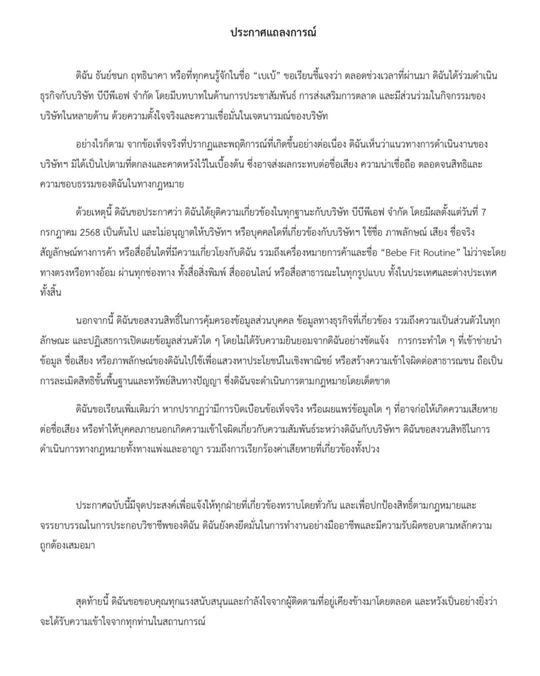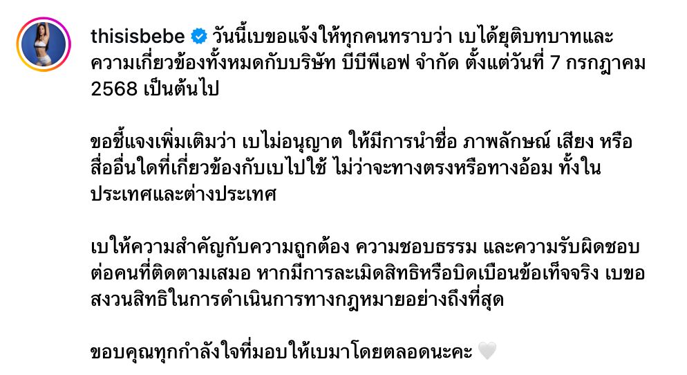 ด้วยเหตุนี้ ดิฉันขอประกาศว่า ดิฉันได้ยุติความเกี่ยวข้องในทุกฐานะกับบริษัท บีบีพีเอฟ จำกัด โดยมีผลตั้งแต่วันที่ 7 กรกฎาคม 2568 เป็นต้นไป และไม่อนุญาตให้บริษัทฯ หรือบุคคลใดที่เกี่ยวข้องกับบริษัทฯ ใช้ชื่อ ภาพลักษณ์ เสียง ชื่อจริงสัญลักษณ์ทางการค้า หรือสื่ออื่นใดที่มีความเกี่ยวโยงกับดิฉัน รวมถึงเครื่องหมายการค้าและชื่อ "Bebe Fit Routine" ไม่ว่าจะโดยทางตรงหรือทางอ้อม ผ่านทุกช่องทาง ทั้งสื่อสิ่งพิมพ์ สื่อออนไลน์ หรือสื่อสาธารณะในทุกรูปแบบ ทั้งในประเทศและต่างประเทศทั้งสิ้น