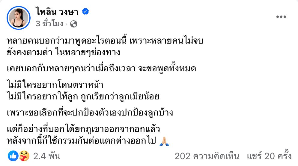 "หลายคนบอกว่ามาพูดอะไรตอนนี้ เพราะหลายคนไม่จบ ยังคงตามด่า ในหลายๆช่องทาง เคยบอกกับหลายๆคนว่าเมื่อถึงเวลา จะขอพูดทั้งหมด ไม่มีใครอยากโดนตราหน้า ไม่มีใครอยากให้ลูก ถูกเรียกว่าลูกเมียน้อย เพราะขอเลือกที่จะปกป้องตัวเองปกป้องลูกบ้าง แต่ก็อย่างที่บอกได้ยกภูเขาออกจากอกแล้ว หลังจากนี้ก็ใช้กรรมกันต่อแตกต่างออกไป"