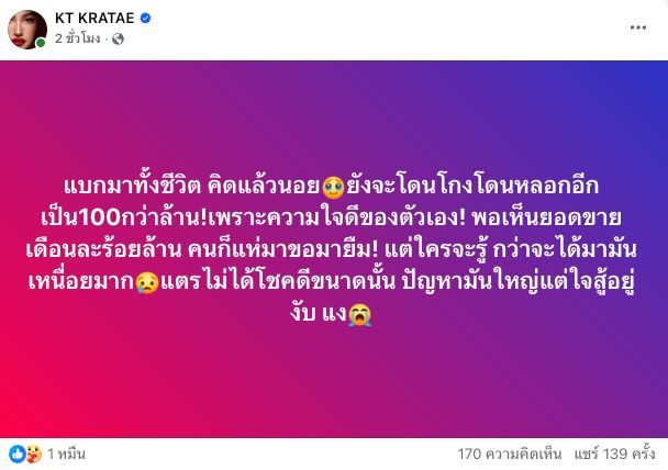 "แบกมาทั้งชีวิต คิดแล้วนอยด์ ยังจะโดนโกง โดนหลอกอีกเป็น 100 กว่าล้าน! เพราะความใจดีของตัวเอง! พอเห็นยอดขายเดือนละร้อยล้าน คนก็แห่มาขอมายืม! แต่ใครจะรู้ กว่าจะได้มามันเหนื่อยมาก แตรไม่ได้โชคดีขนาดนั้น ปัญหามันใหญ่แต่ใจสู้อยู่งับ แง"