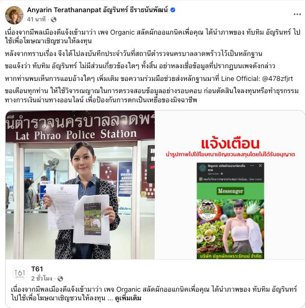 “เนื่องจากมีพลเมืองดีแจ้งเข้ามาว่า เพจ Organic สลัดผักออร์แกนิกเพื่อคุณ ได้นำภาพของ ทับทิม อัญรินทร์ ไปใช้เพื่อโฆษณาเชิญชวนให้ลงทุน หลังจากทราบเรื่อง จึงได้ไปลงบันทึกประจำวันที่สถานีตำรวจนครบาลลาดพร้าวไว้เป็นหลักฐาน ขอแจ้งว่า ทับทิม อัญรินทร์ ไม่มีส่วนเกี่ยวข้องใดๆ ทั้งสิ้น อย่าหลงเชื่อข้อมูลที่ปรากฏบนเพจดังกล่าว