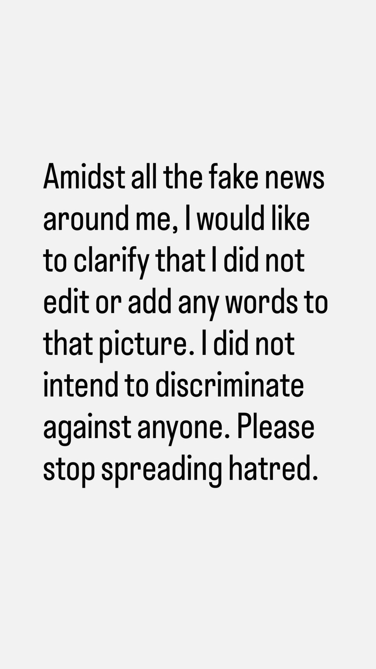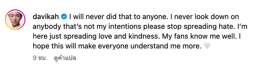 พร้อมแคปชั่นว่า "ฉันไม่มีทางทำแบบนั้นกับใครทั้งสิ้น ไม่เคยดูถูกใครเลย นั่นไม่ใช่เจตนาของฉันเลยจริง ๆ ขอร้องให้หยุดเผยแพร่ความเกลียดชังเถอะนะคะ สิ่งที่ฉันตั้งใจมีแค่การส่งต่อความรักและความเมตตา แฟน ๆ ของฉันรู้ดีว่า ฉันเป็นคนแบบไหน หวังว่าข้อความนี้จะช่วยให้ทุกคนเข้าใจฉันมากขึ้นค่ะ"