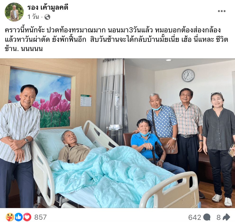 ทำเอาหลายคนเป็นห่วงและส่งกำลังใจให้กับ พ่อรอง เค้ามูลคดี นักแสดงอาวุโสกันแบบรัวๆ เมื่อเจ้าตัวโพสต์รูปตัวเองนอนอยู่ที่โรงพยาบาลท่ามกลางเพื่อนๆ ที่มาเยี่ยม และเขียนข้อความเอาไว้ว่า
