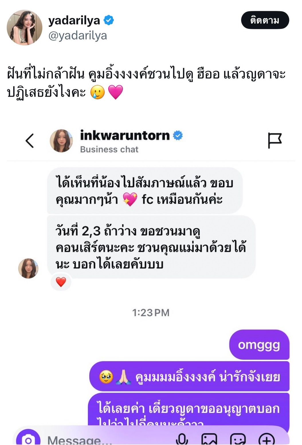 ล่าสุดทำเอา ญดา แทบกรี๊ดโดยเจ้าตัวได้แคปข้อความแชทที่อิ๊งค์ทักมาหาลงใน X ซึ่งในแชทดังกล่าวมีข้อความว่า “ได้เห็นที่น้องไปสัมภาษณ์แล้ว ขอบคุณมาก ๆ น้า FC เหมือนกันค่ะ วันที่ 2,3 ถ้าว่าง ขอชวนมาดูคอนเสิร์ตนะคะ ชวนคุณแม่มาด้วยได้นะ บอกได้เลยคับ”