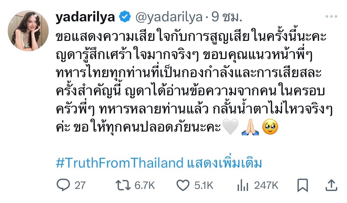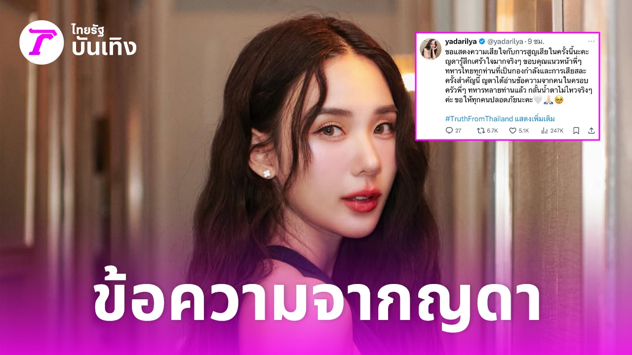 "ขอแสดงความเสียใจกับการสูญเสียในครั้งนี้นะคะ ญดารู้สึกเศร้าใจมากจริงๆ ขอบคุณแนวหน้าพี่ๆ ทหารไทยทุกท่านที่เป็นกองกำลังและการเสียสละครั้งสำคัญนี้ ญดาได้อ่านข้อความจากคนในครอบครัวพี่ๆ ทหารหลายท่านแล้ว กลั้นน้ำตาไม่ไหวจริงๆ ค่ะ ขอให้ทุกคนปลอดภัยนะคะ" พร้อมใส่แฮชแท็ก #TruthFromThailand อีกด้วย