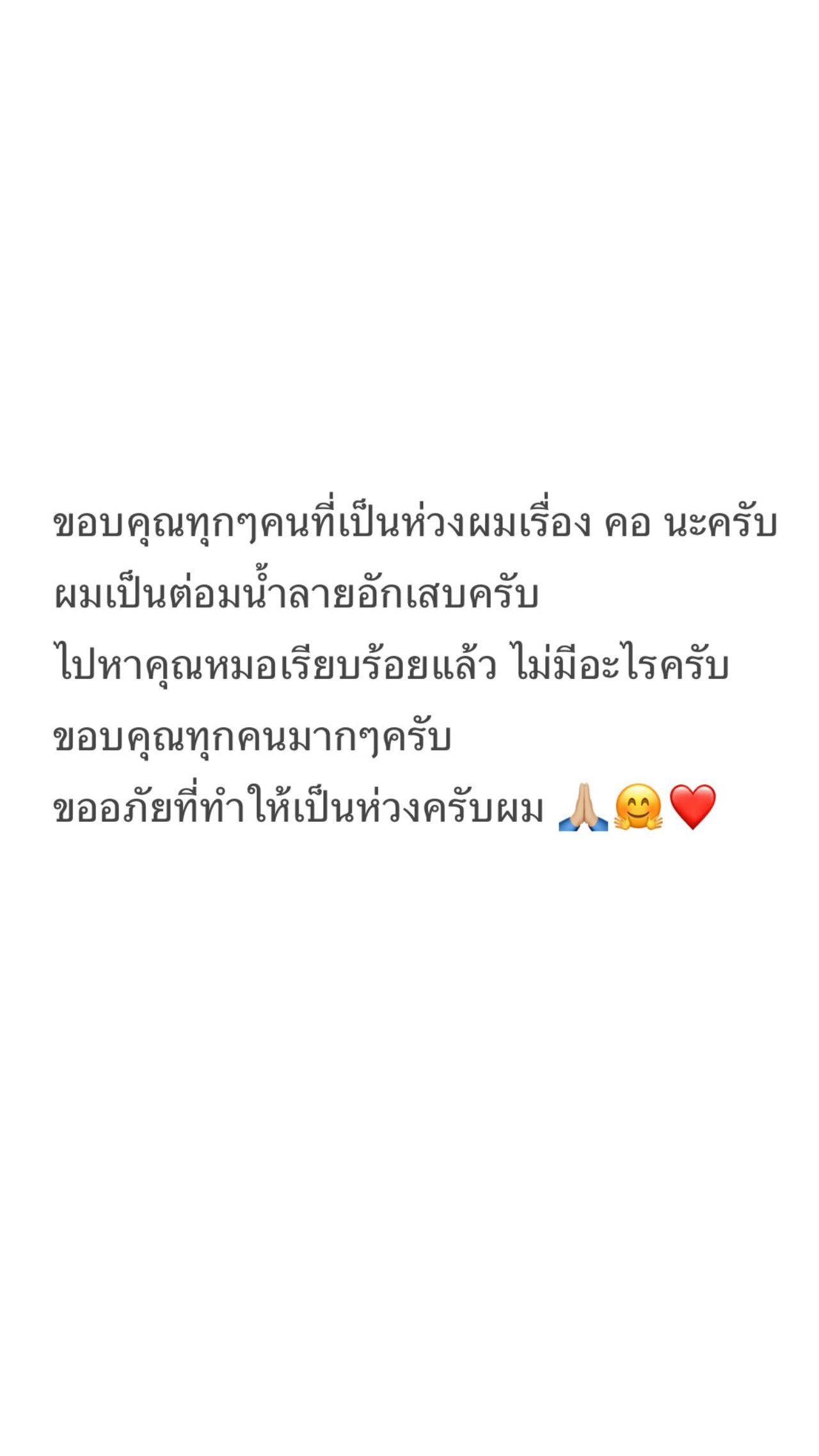 "ขอบคุณทุกๆ คนที่เป็นห่วงผมเรื่อง คอ นะครับ ผมเป็นต่อมน้ำลายอักเสบครับ ไปหาคุณหมอมาเรียบร้อยแล้ว ไม่มีอะไรครับ ขอบคุณทุกคนมากๆ ครับ ขออภัยที่ทำให้เป็นห่วงครับผม"